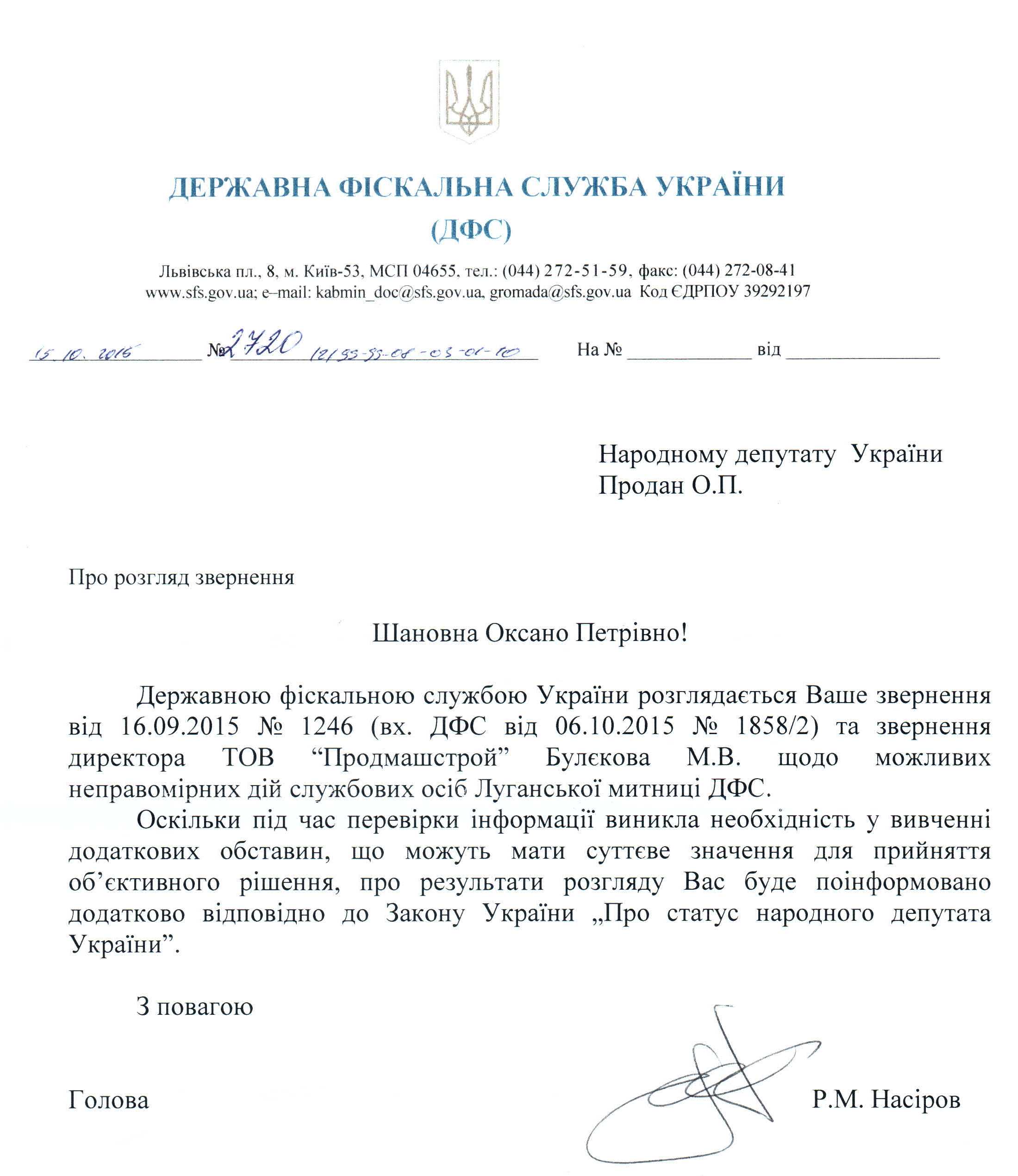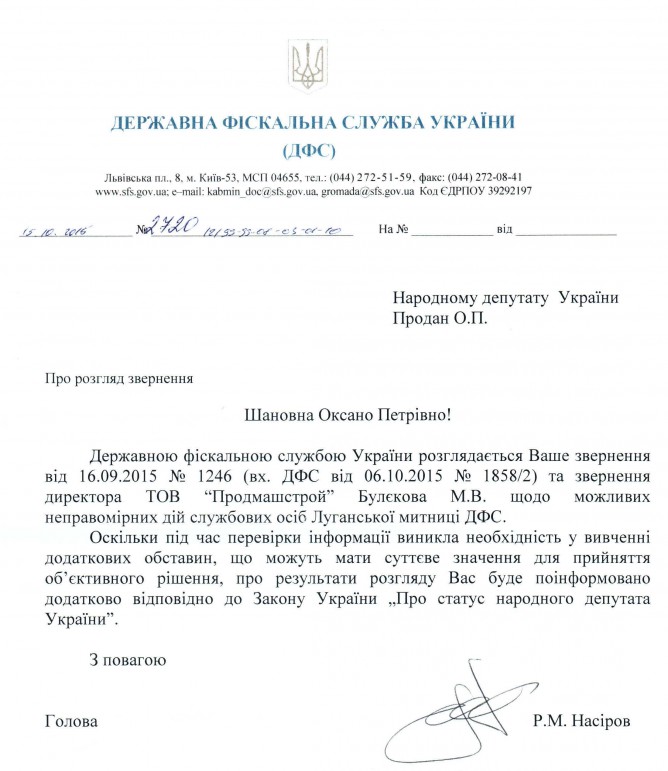 Головна > Верховна Рада України > Вхідна документація > Відповідь ДФС України про подовження строків розгляду депутатського звернення щодо порушення законодавства службовими особами Луганської митниці ДФС