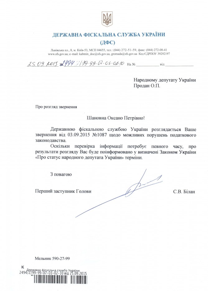 Вхідна документація > Відповідь ДФС України стосовно продовження строків розгляду депутатського звернення щодо порушення посадовими особами ДПІ у Красногвардійському районі м. Дніпропетровська ГУ ДФС у Дніпропетровській області податкового законодавства України