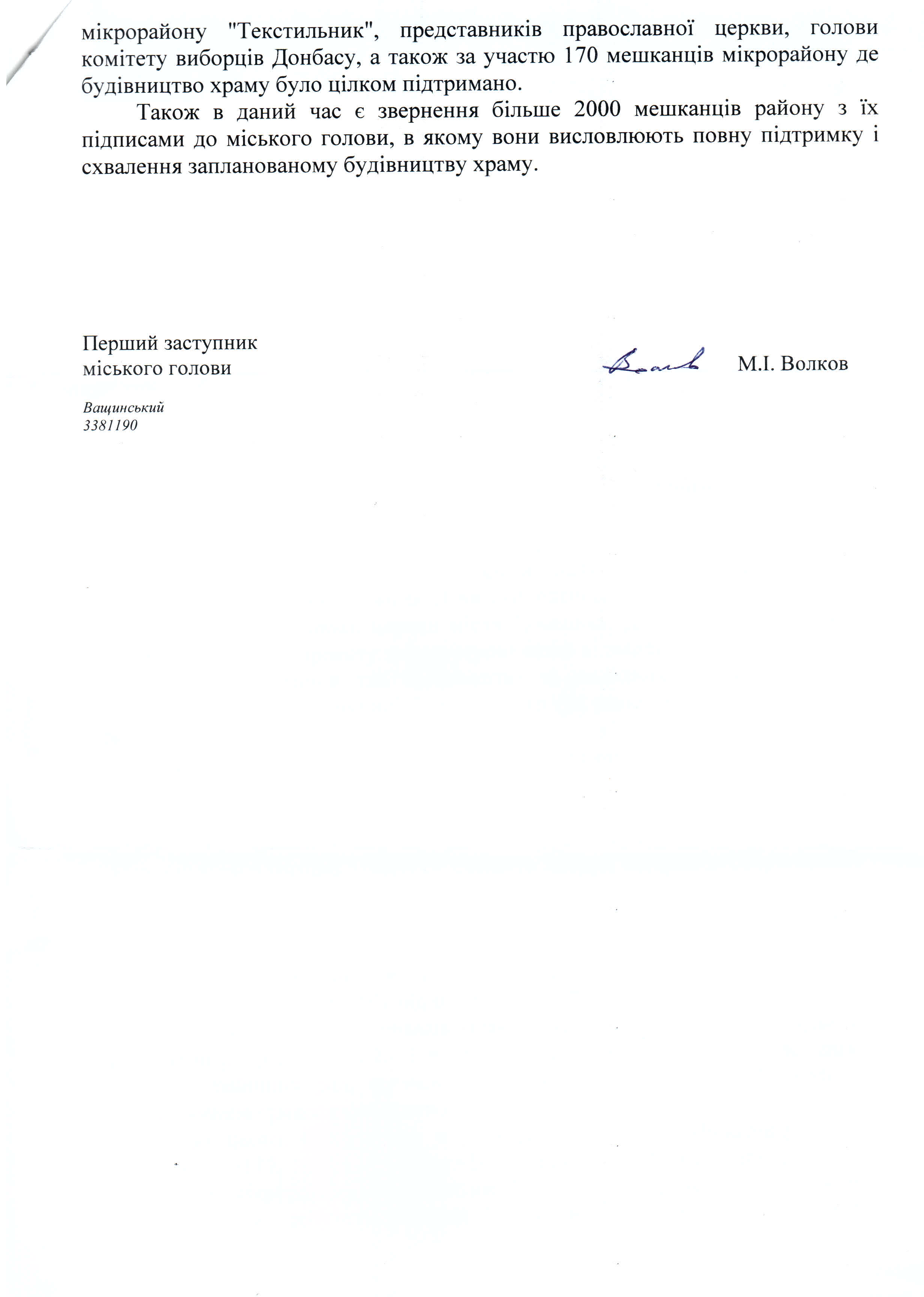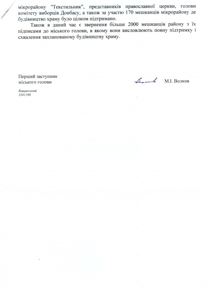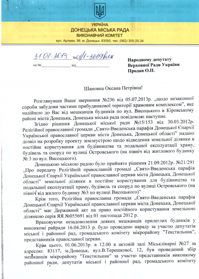 21Сер Коментування вимкнено Відповідь Донецької міської ради на депутатське звернення щодо перевірки законності забудови частини прибудинкової території храмовим комплексом