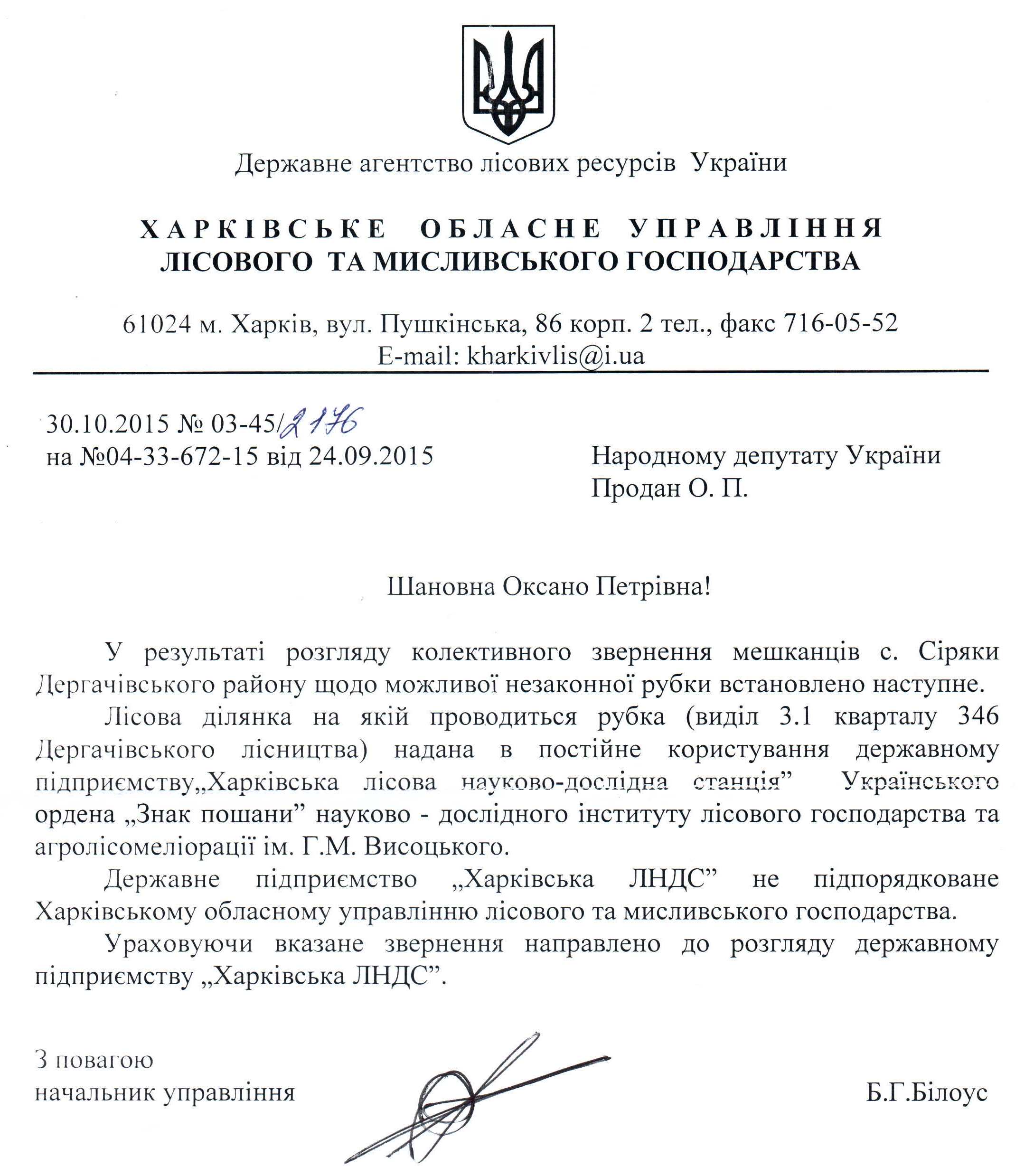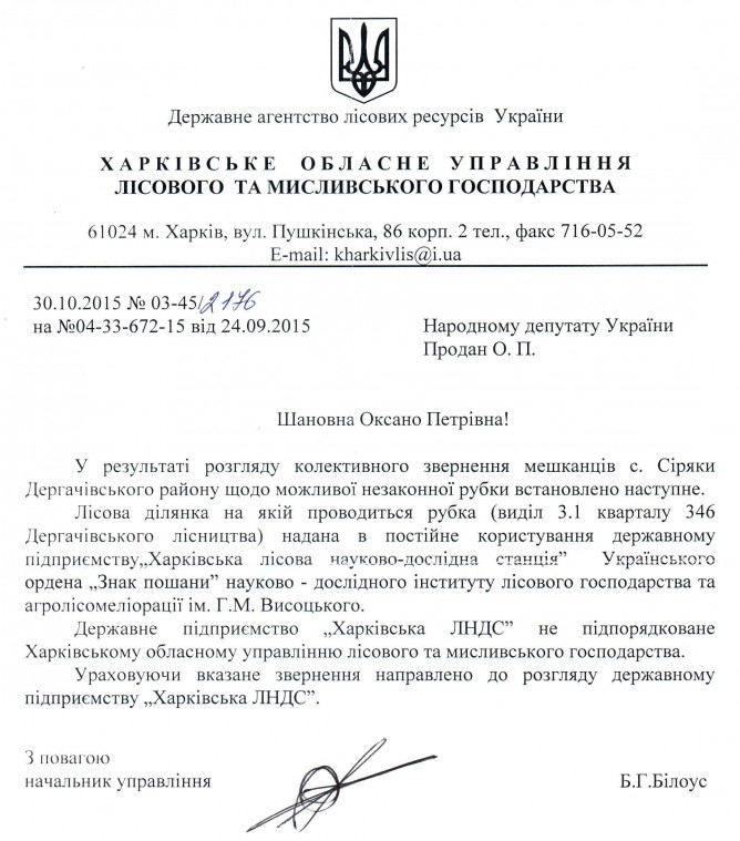 09Гру Коментування вимкнено Відповідь Харківського обласного управління лісового та мисливського господарства Держлісагентства України щодо несанкціонованої вирубки лісу в Дергачівському районі Харківської області ДЕПУТАТСЬКЕ ЗВЕРНЕННЯ