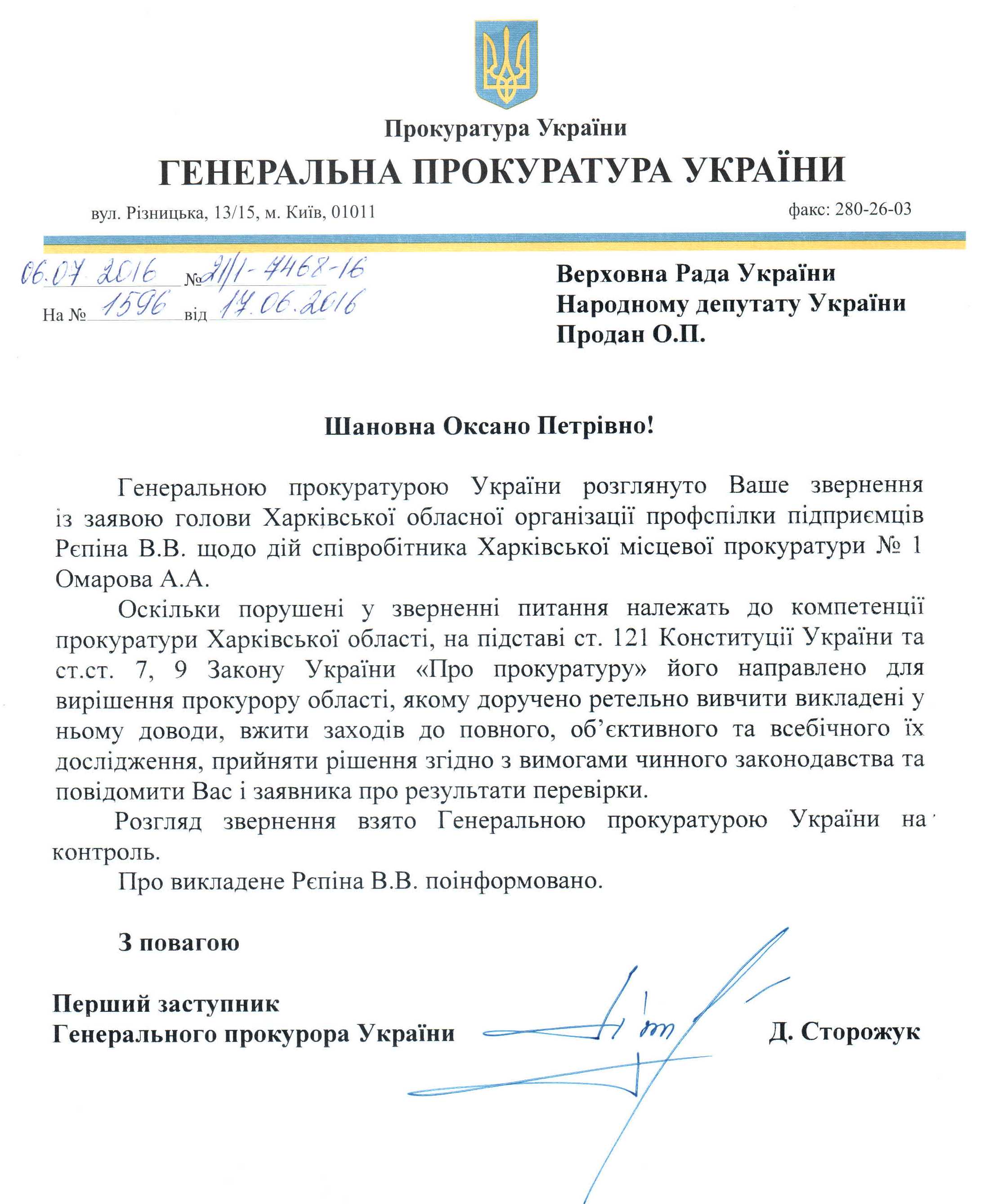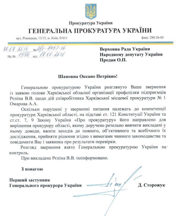 01Сер Коментування вимкнено Відповідь Генеральної прокуратури України на депутатське звернення щодо дій співробітника Харківської місцевої прокуратури №1 ДЕПУТАТСЬКЕ ЗВЕРНЕННЯ
