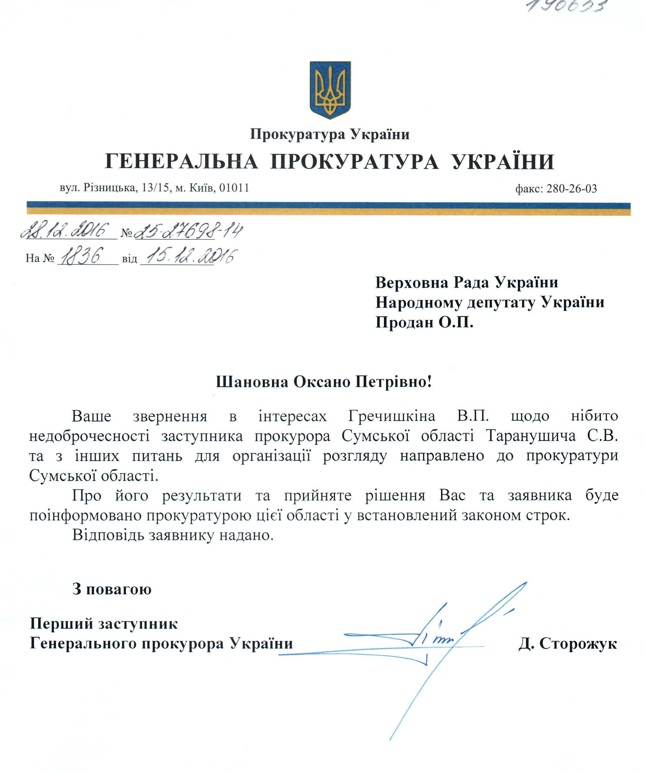 01Лют Коментування вимкнено Відповідь Генеральної прокуратури України на депутатське звернення щодо можливих порушень законодавства посадовими особами прокуратури Сумської області ДЕПУТАТСЬКЕ ЗВЕРНЕННЯ