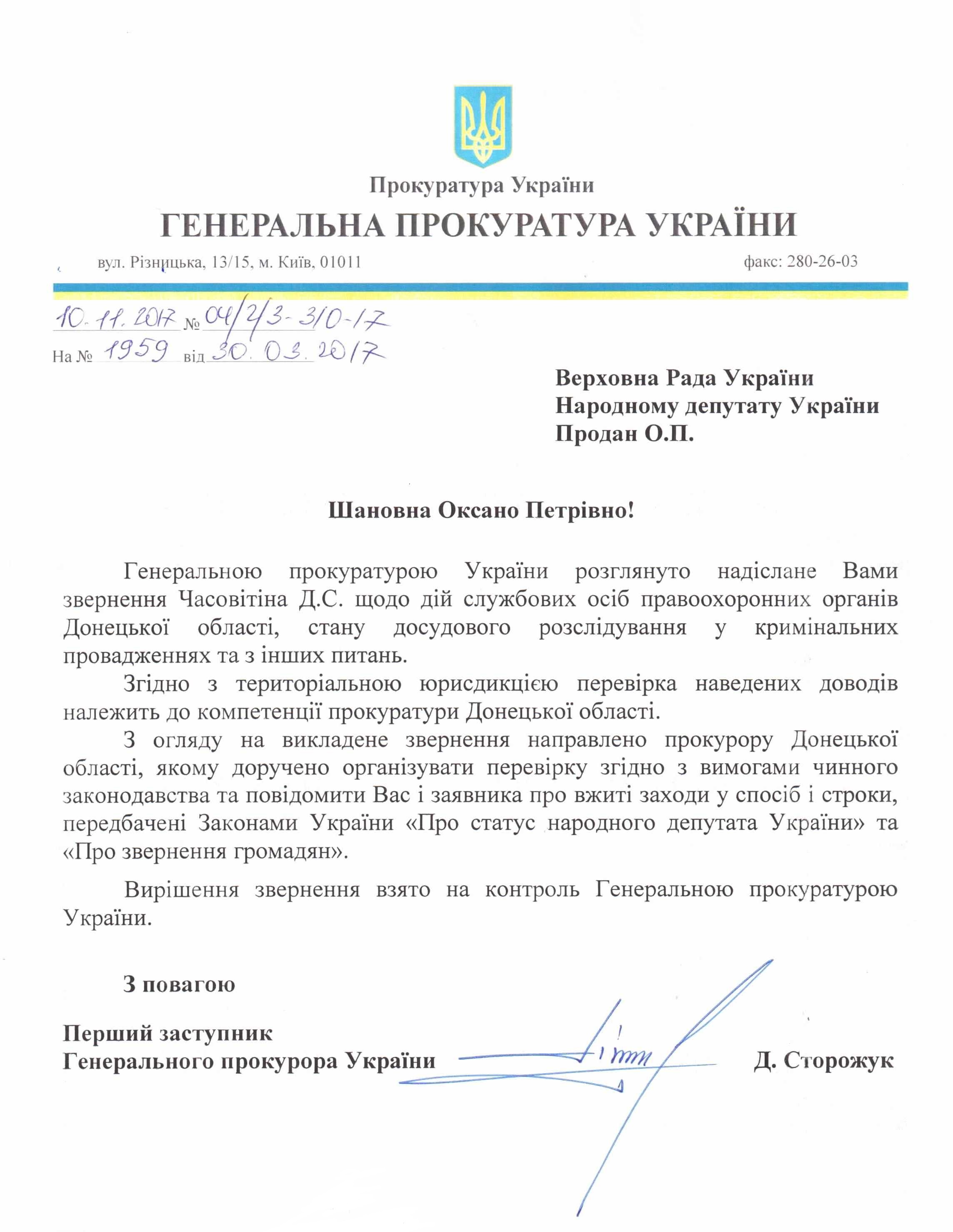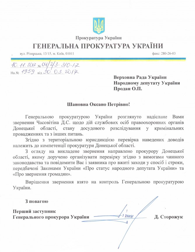 Відповідь Генеральної прокуратури України на депутатське звернення щодо можливих порушень законодавства співробітниками Дружківського відділення поліції Краматорького ВП ГУНП в Донецькій області