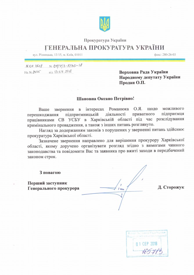 09Сер Коментування вимкнено Відповідь Генеральної прокуратури України на депутатське звернення щодо можливих порушень законодавства співробітниками УСБУ в Харківській області ДЕПУТАТСЬКЕ ЗВЕРНЕННЯ