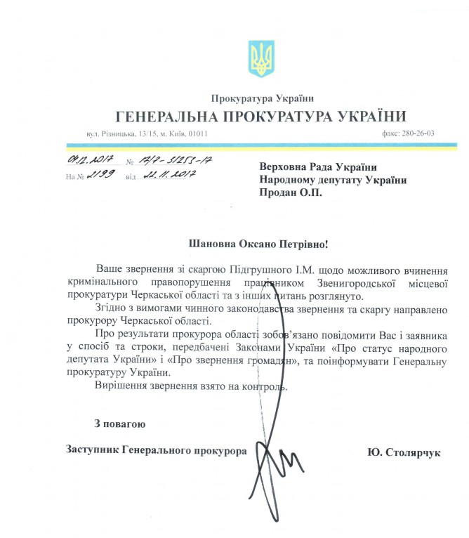 15Гру Коментування вимкнено Відповідь Генеральної прокуратури України на депутатське звернення щодо можливих порушень законодавства співробітниками Звенигородської місцевої прокуратури Черкаської області ДЕПУТАТСЬКЕ ЗВЕРНЕННЯ