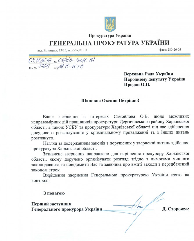 Вхідна документація > Відповідь Генеральної прокуратури України на депутатське звернення щодо можливих порушень законодавства співробітниками прокуратури Дергачівського району Харківської області та прокуратури Харківської області