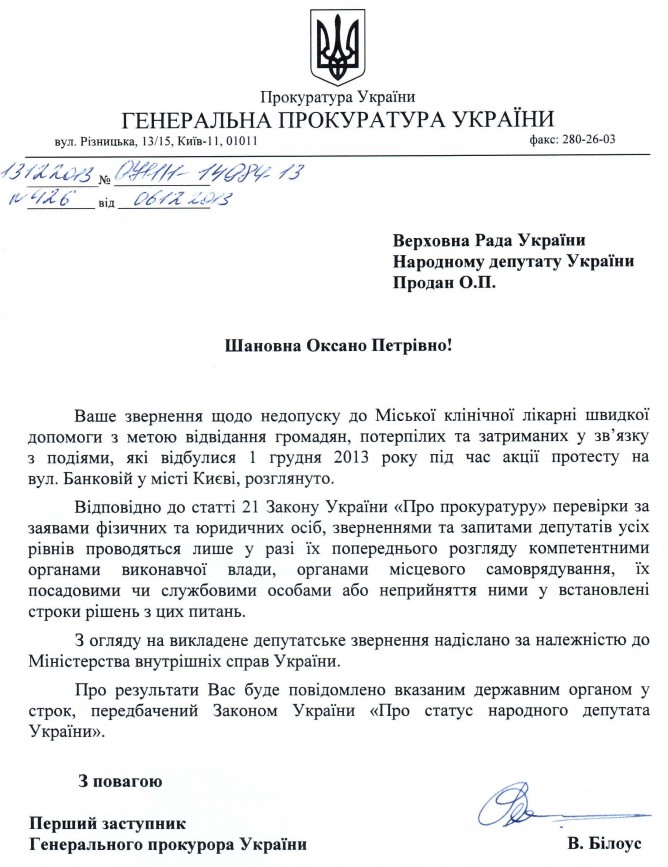 Вхідна документація > Відповідь Генеральної прокуратури України на депутатське звернення щодо недопуску народного депутата України до Міської клінічної лікарні швидкої допомоги з метою відвідування постраждалих під час подій на Банковій 01 грудня 2013 року