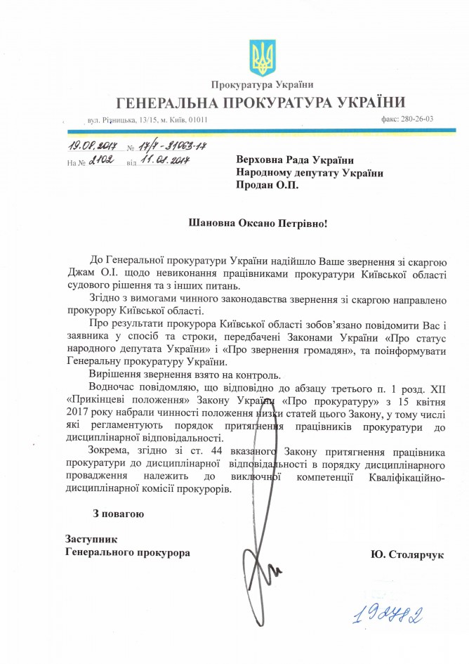 01Вер Коментування вимкнено Відповідь Генеральної прокуратури України на депутатське звернення за скаргою Джам О.І. щодо дій співробітників прокуратури Київської області