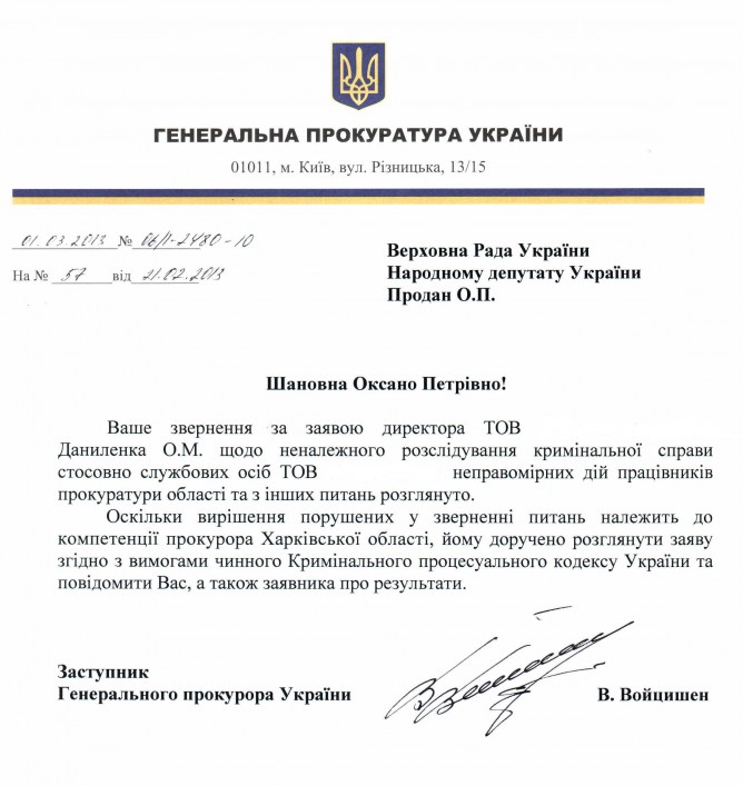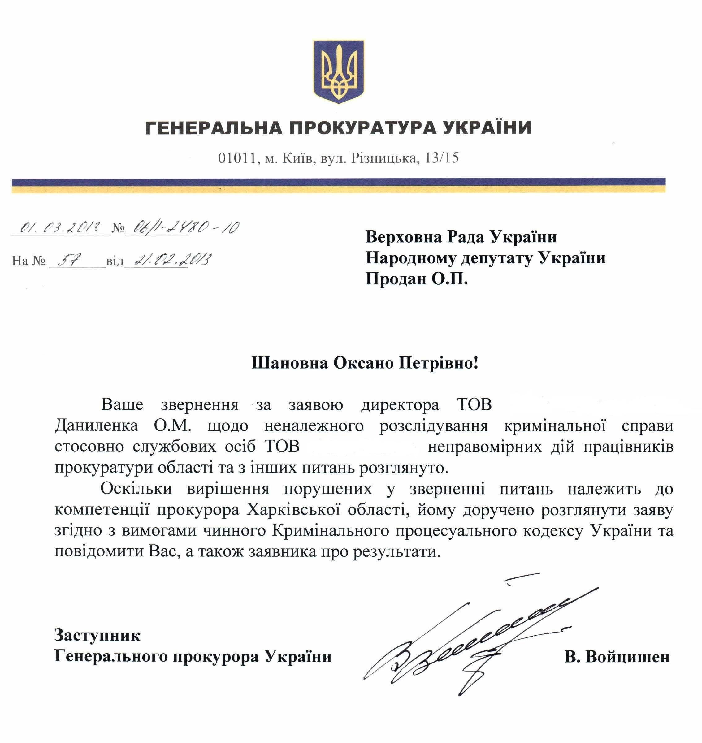 Вхідна документація > Відповідь Генеральної прокуратури України про перенаправлення депутатського звернення щодо здійснення неналежного розслідування прокуратурою Харківської області кримінальної справи за належністю