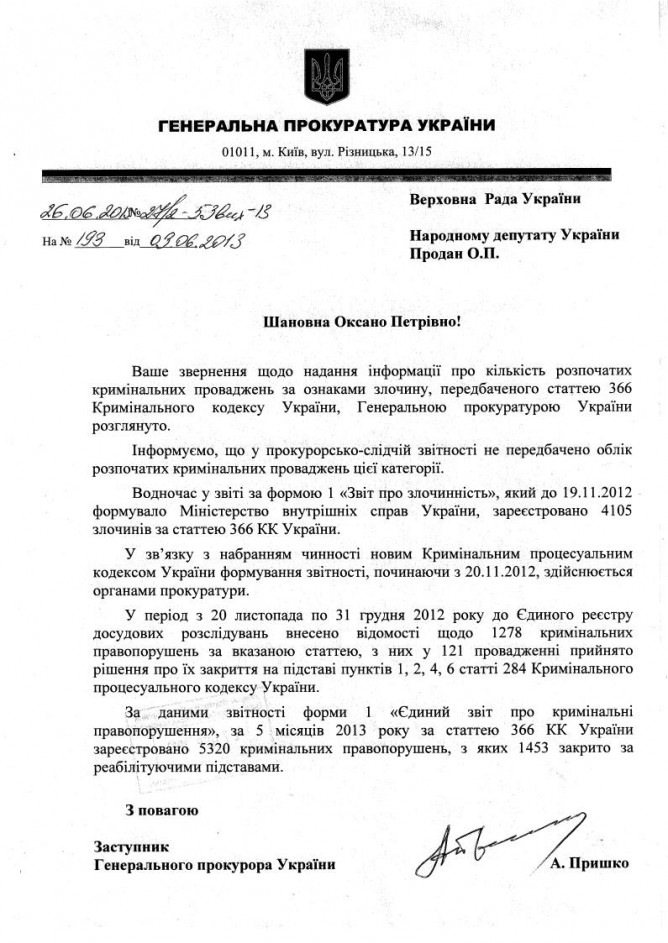 09Лип Коментування вимкнено Відповідь Генеральної прокуратури України щодо кількості розпочатих кримінальних проваджень за ознаками злочину, передбаченого статтею 366 Кримінального кодексу України
