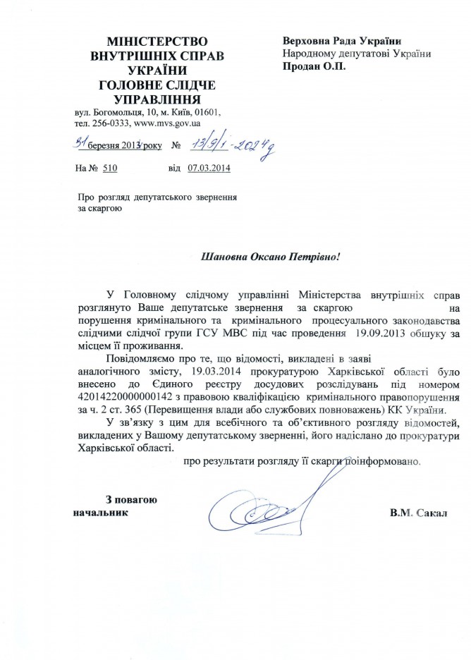 Відповідь Головного слідчого управління МВС України на депутатське звернення щодо порушення кримінального та кримінального процесуального законодавства слідчими слідчої групи ГСУ МВС України під час проведення обшуку
