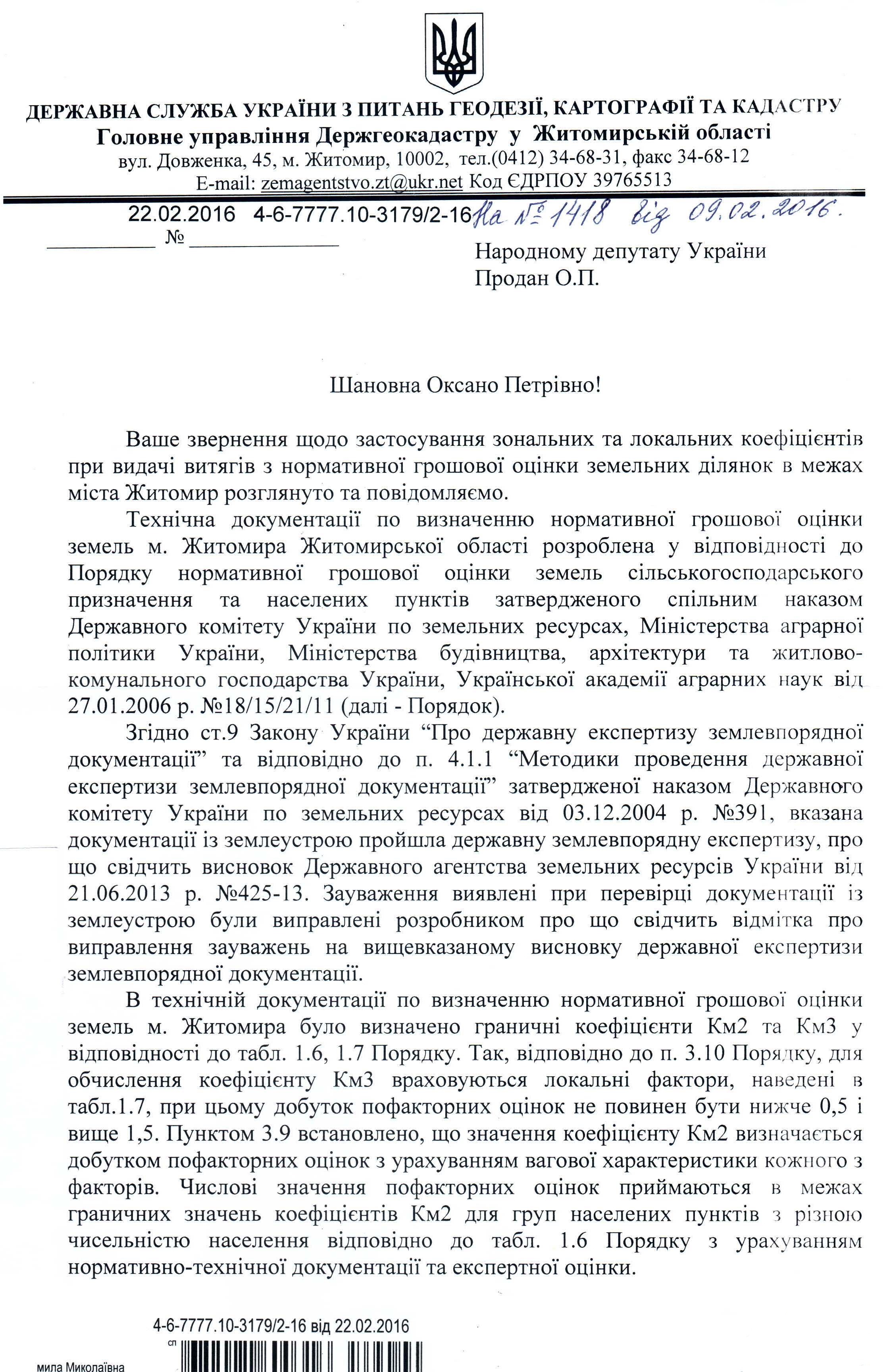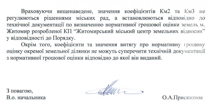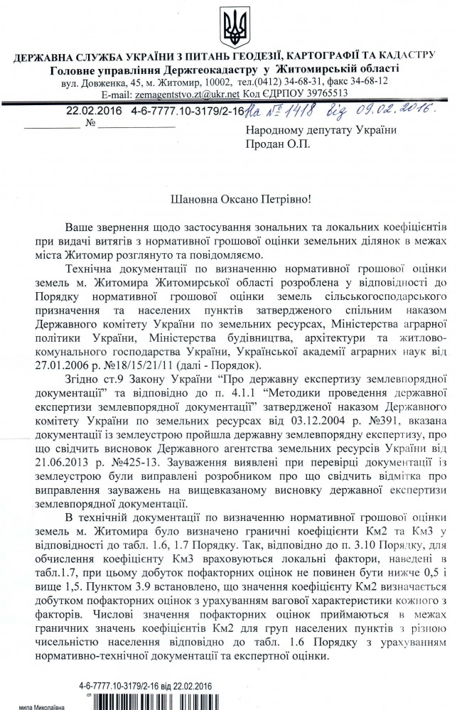 Вхідна документація > Відповідь Головного управління Держгеокадастру у Житомирській області на депутатське звернення щодо надання інформації про коефіцієнти, які застосовуються для розрахунку коефіцієнту місцеположення земельної ділянки