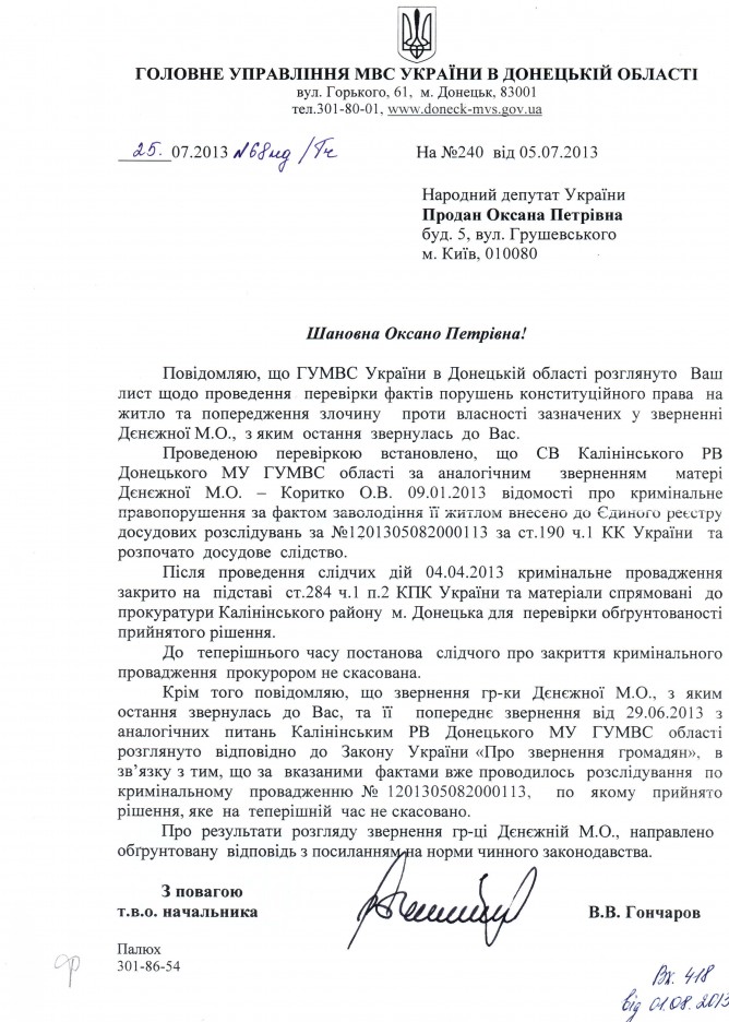 Вхідна документація > Відповідь Головного управління МВС України в Донецькій області на депупатське звернення за зверененням громадянки Денєжної М.О. щодо перевірки фактів порушення права на житло та попередження злочину проти власності