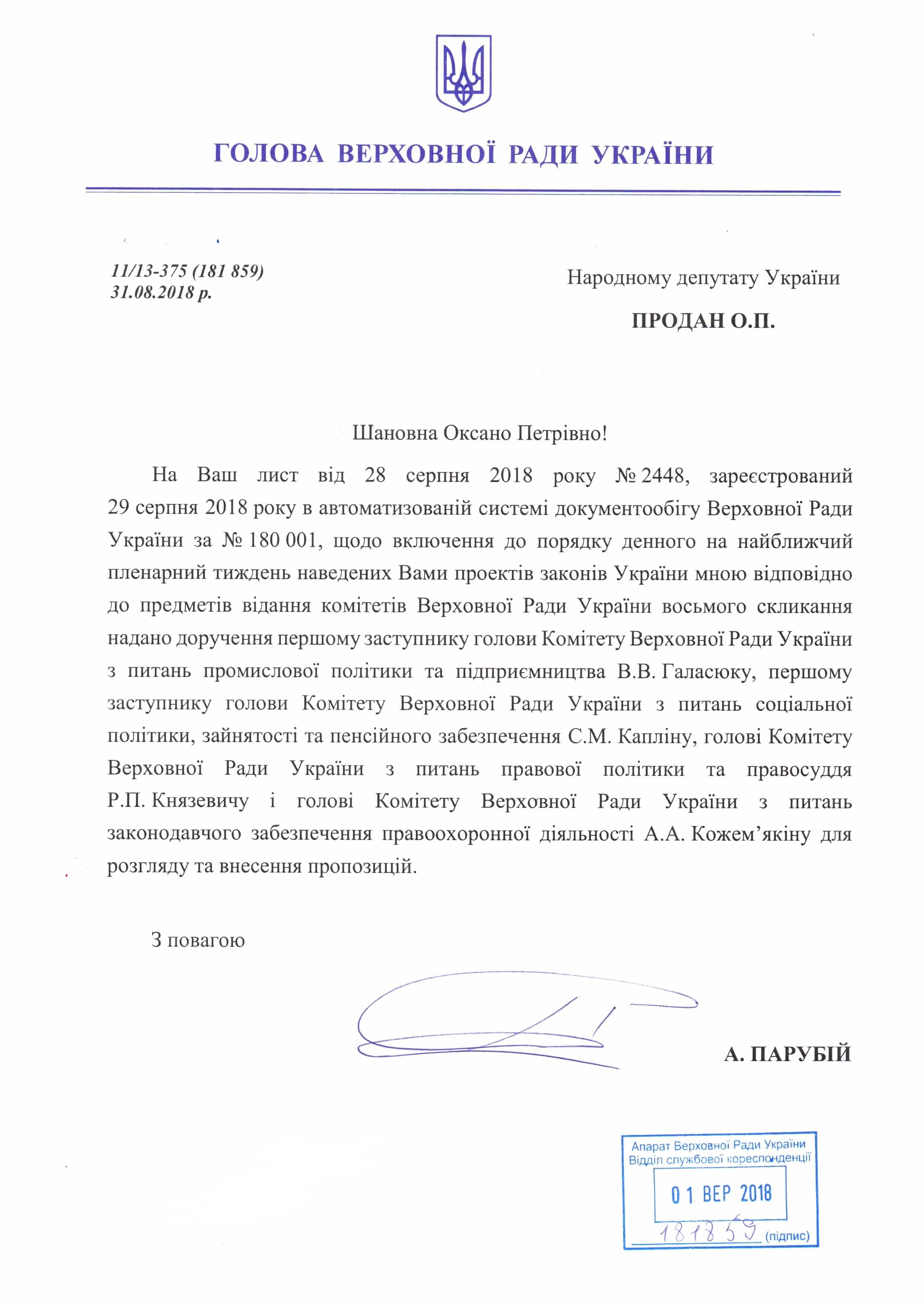 07Вер Коментування вимкнено Відповідь Голови Верховної Ради України А.В. Парубія на депутатське звернення щодо включення законопроектів до порядку денного пленарних засідань ДЕПУТАТСЬКЕ ЗВЕРНЕННЯ