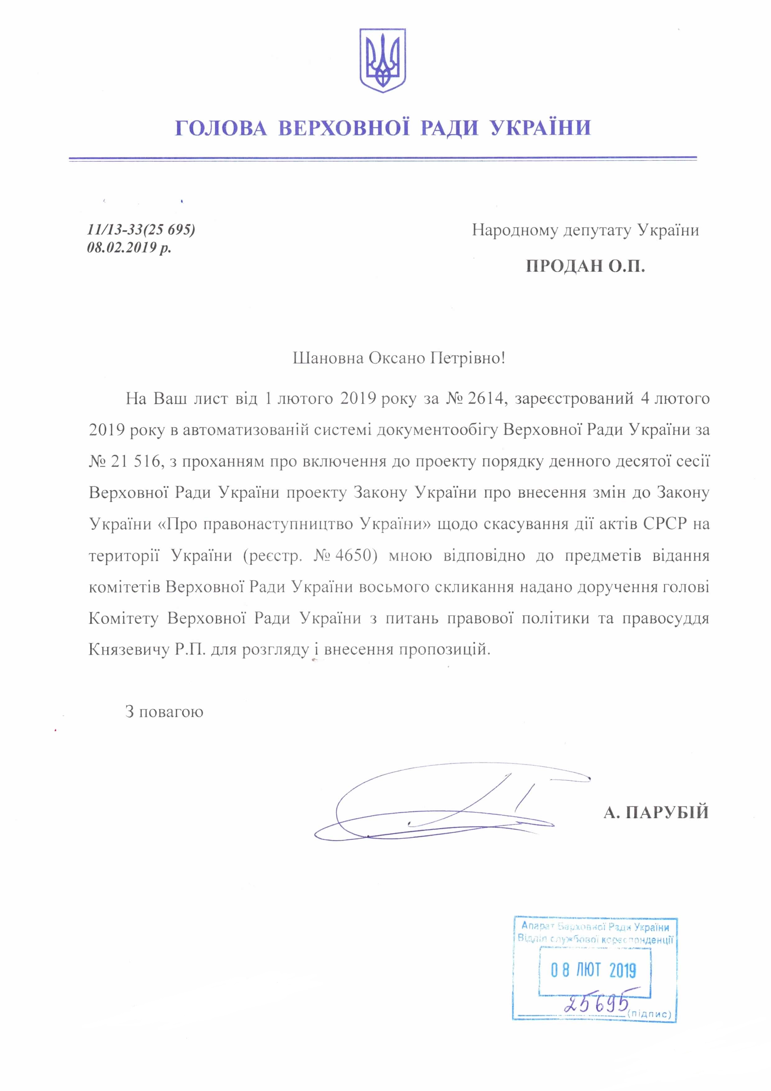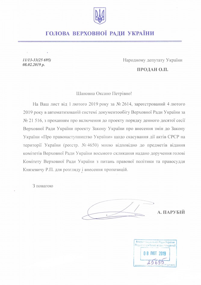 Відповідь Голови Верховної Ради України А.В. Парубія на депутатське звернення щодо законопроекту «Про внесення змін до Закону України «Про правонаступництво України» щодо скасування дії актів СРСР на території України», реєстр. №4650