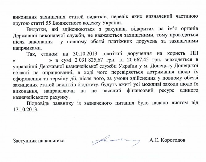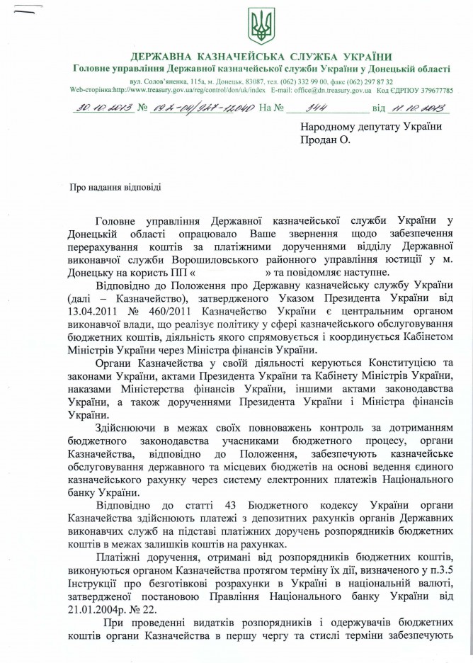 08Лис Коментування вимкнено Відповідь ГУ Держказначейства України в Донецькій області щодо забезпечення перерахування коштів за платіжними дорученнями відділу Державної виконавчої служби Ворошиловського РУЮ у м. Донецьку
