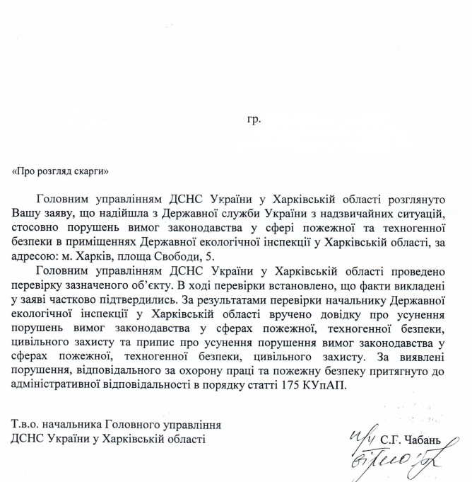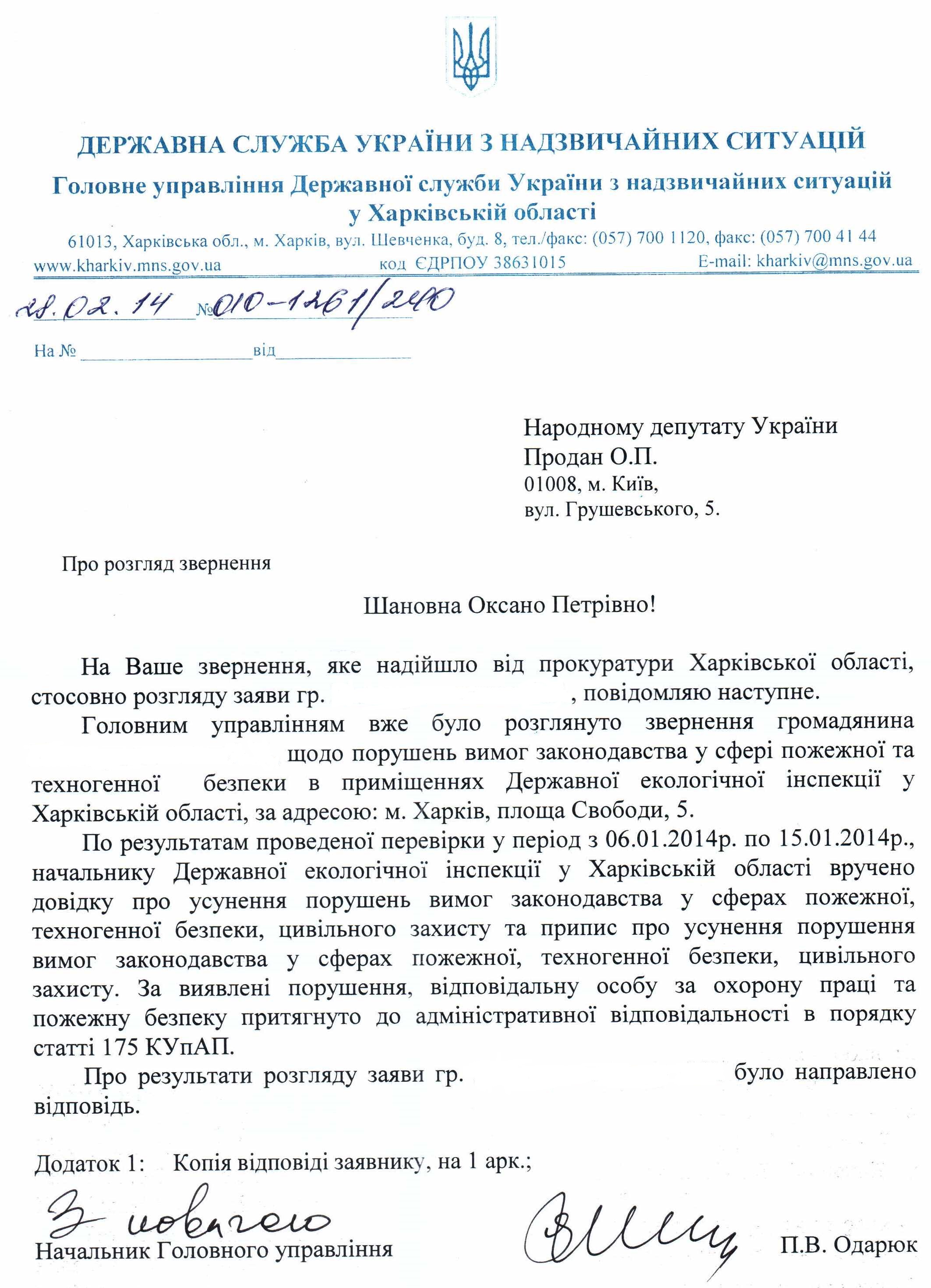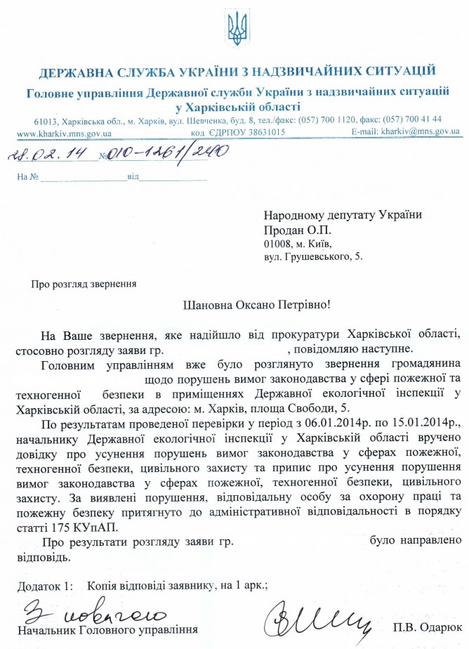 Головна > Верховна Рада України > Вхідна документація > Відповідь ГУ Держслужби України з надзвичайних ситуацій у Харківській області на депутатське звернення щодо порушення законодавства у сфері пожежної бузпеки в приміщеннях Державної екологічної інспекції у Харківській області