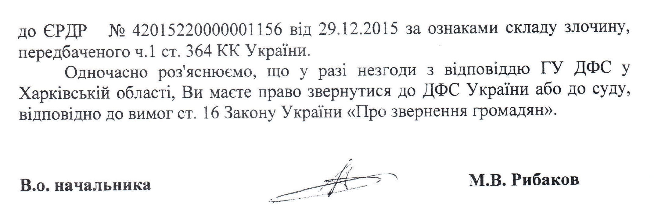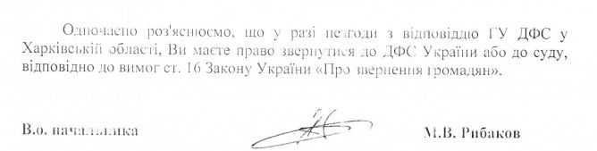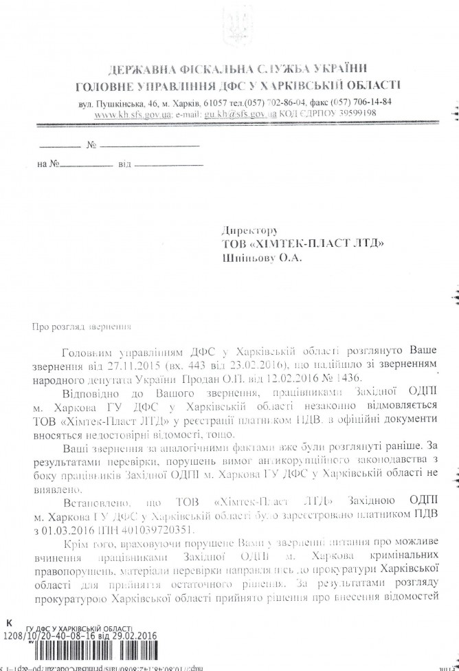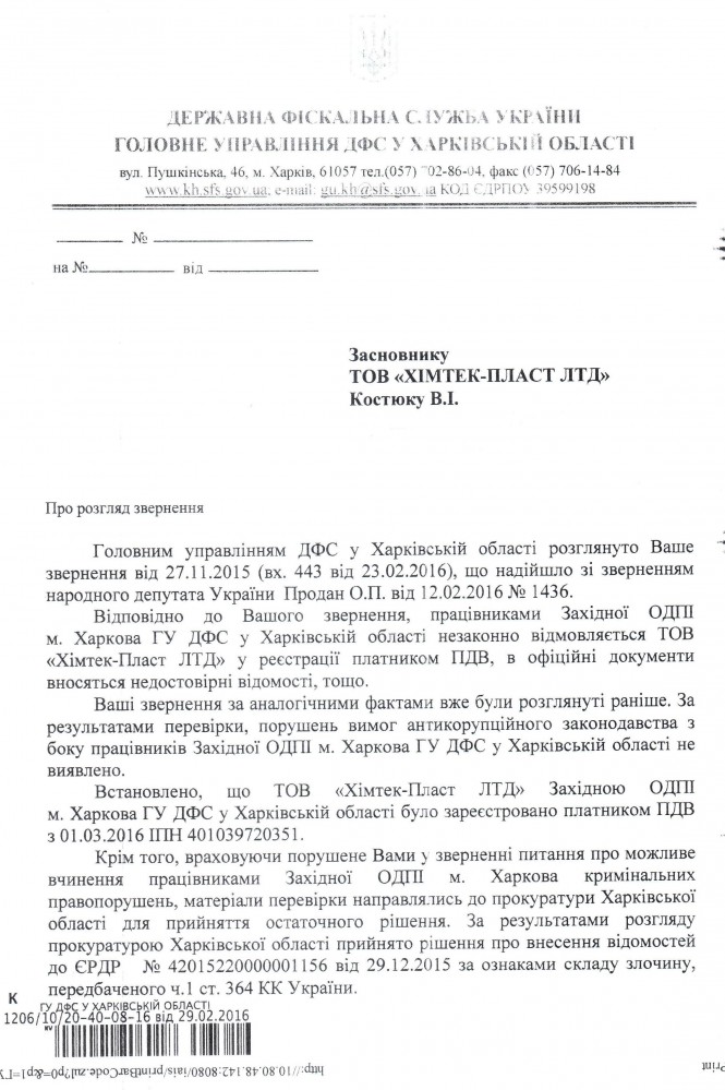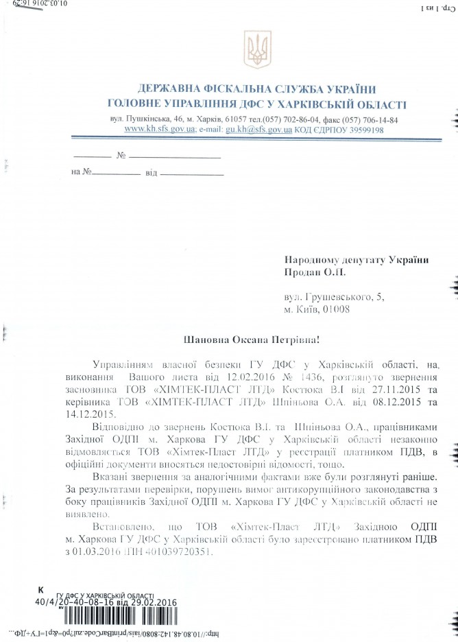 23Бер Коментування вимкнено Відповідь ГУ ДФС у Харківській області на депутатське звернення щодо відмови підприємству у реєстрації платником ПДВ ДЕПУТАТСЬКЕ ЗВЕРНЕННЯ