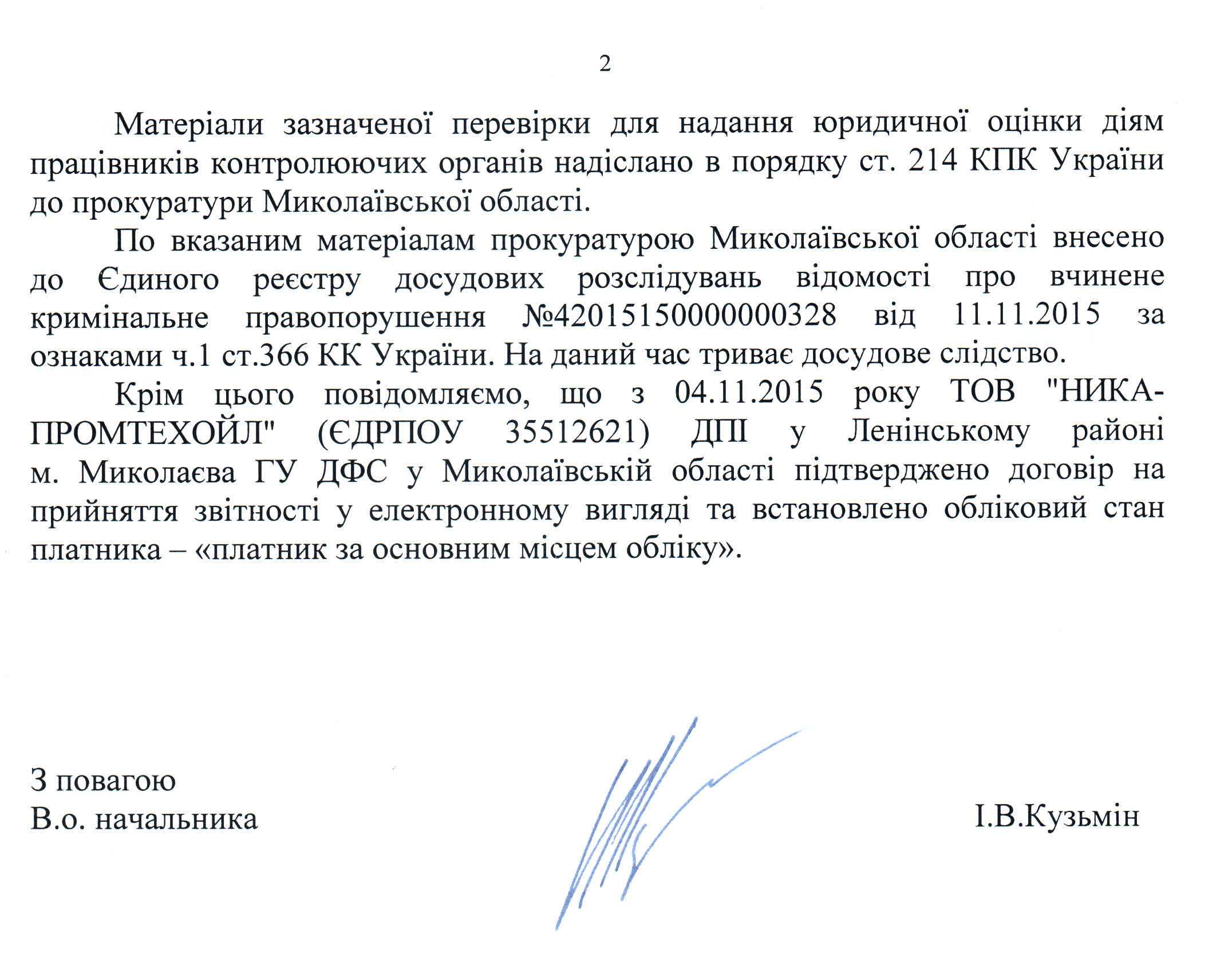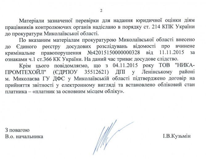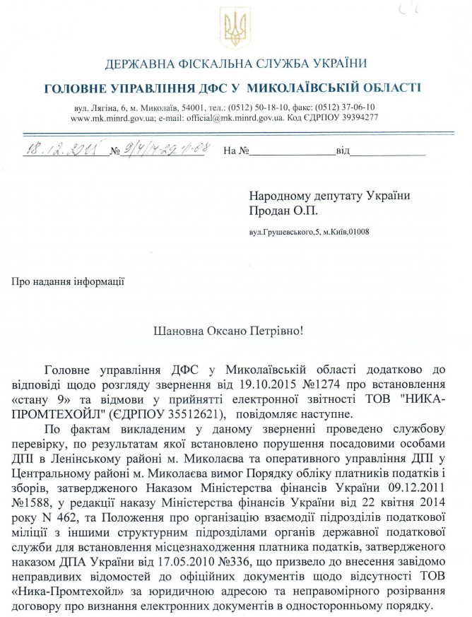 Вхідна документація > Відповідь ГУ ДФС у Миколаївській області на депутатське звернення щодо порушення співробітниками ДПІ у Ленінському районі м. Миколаєва ГУ ДФС у Миколаївській області податкового законодавства України
