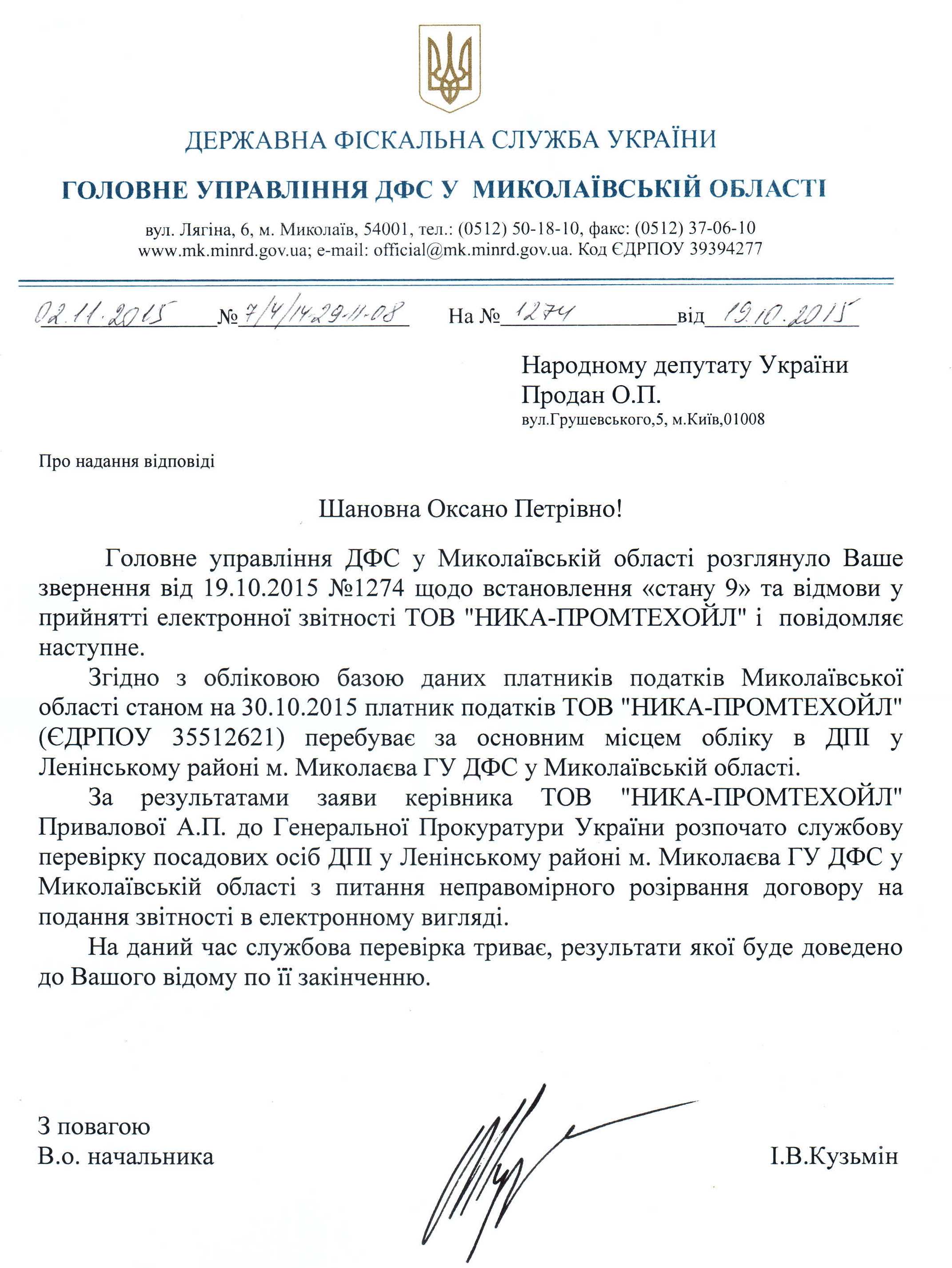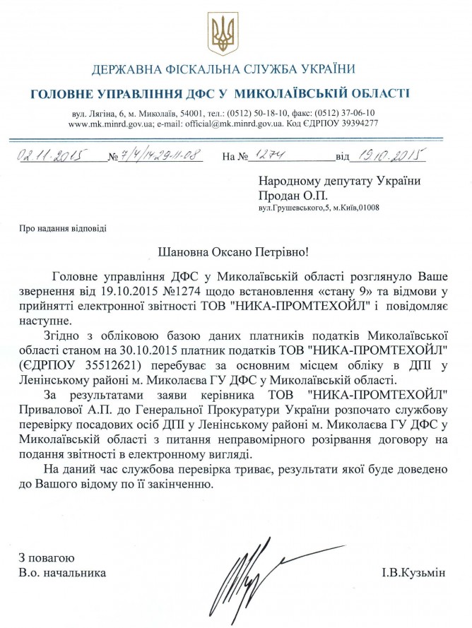 Вхідна документація > Відповідь ГУ ДФС у Миколаївській області на депутатське звернення щодо порушення співробітниками ДПІ у Ленінському районі м. Миколаєва ГУ ДФС у Миколаївській області податкового законодавства України