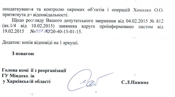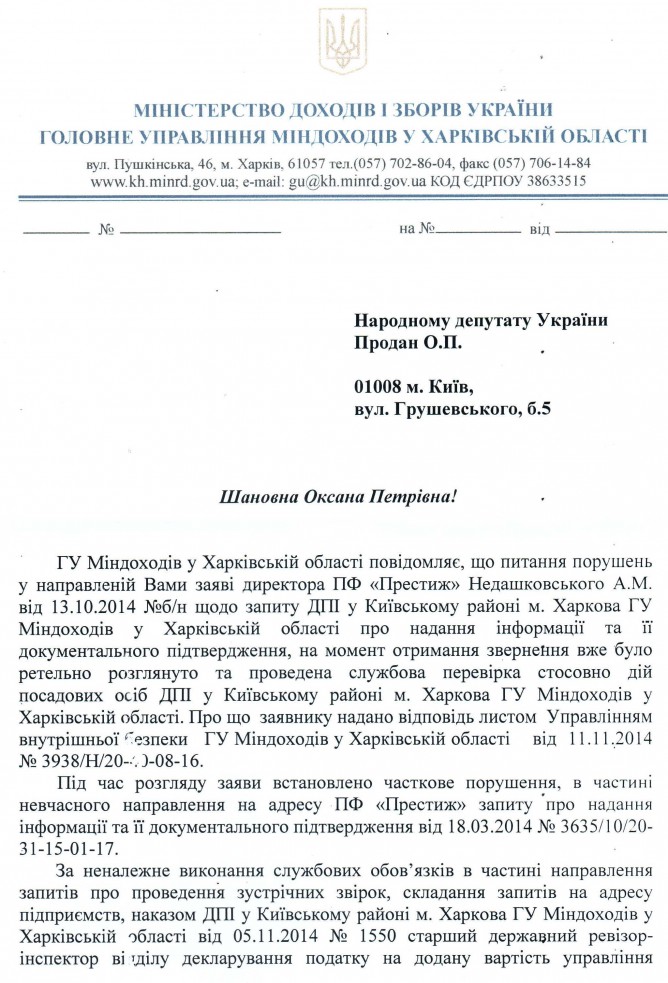 17Бер Коментування вимкнено Відповідь ГУ Міндоходів у Харківській області на депутатське звернення щодо перевірки законності дій посадових осіб ДПІ у Київському районі м. Харкова