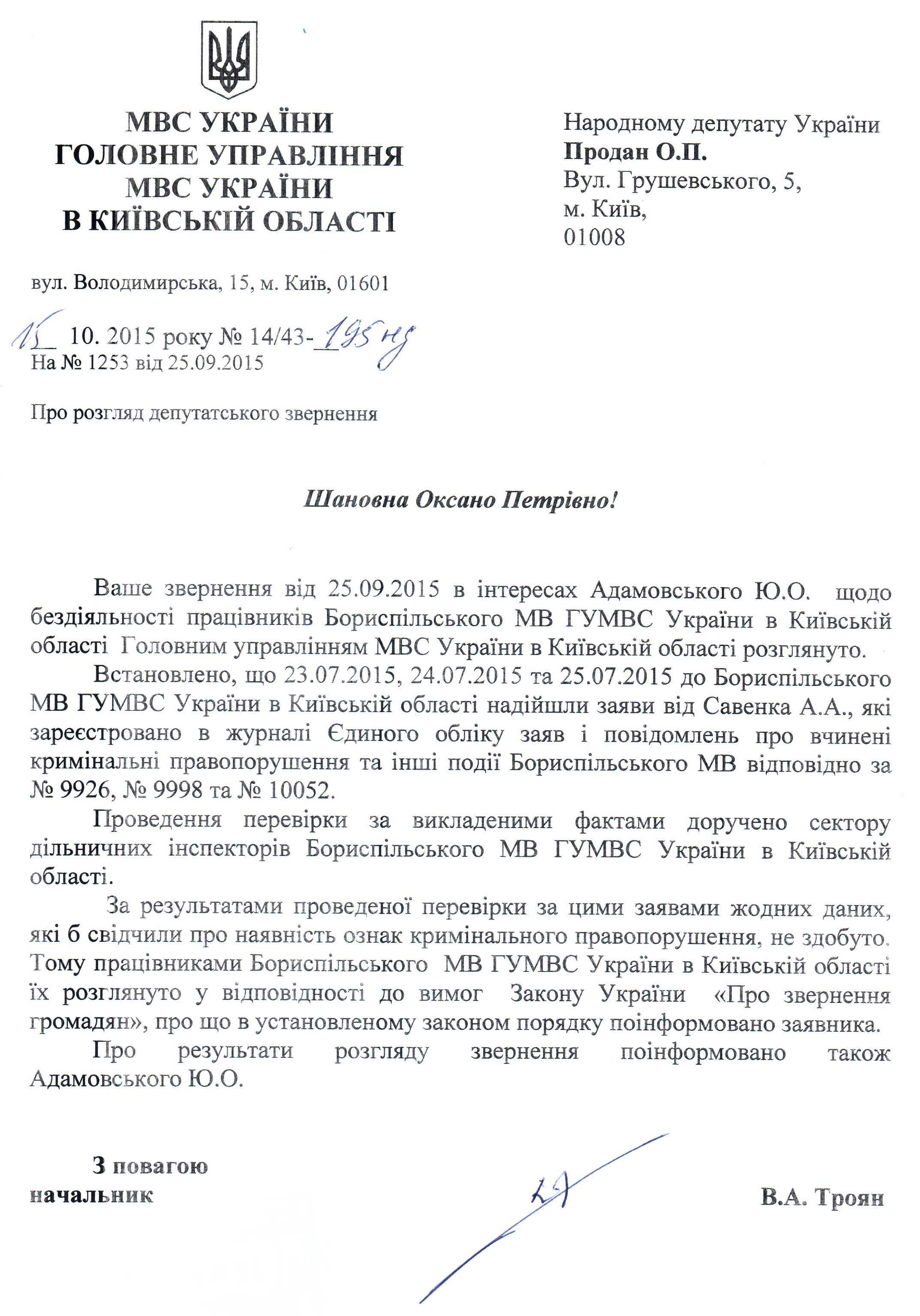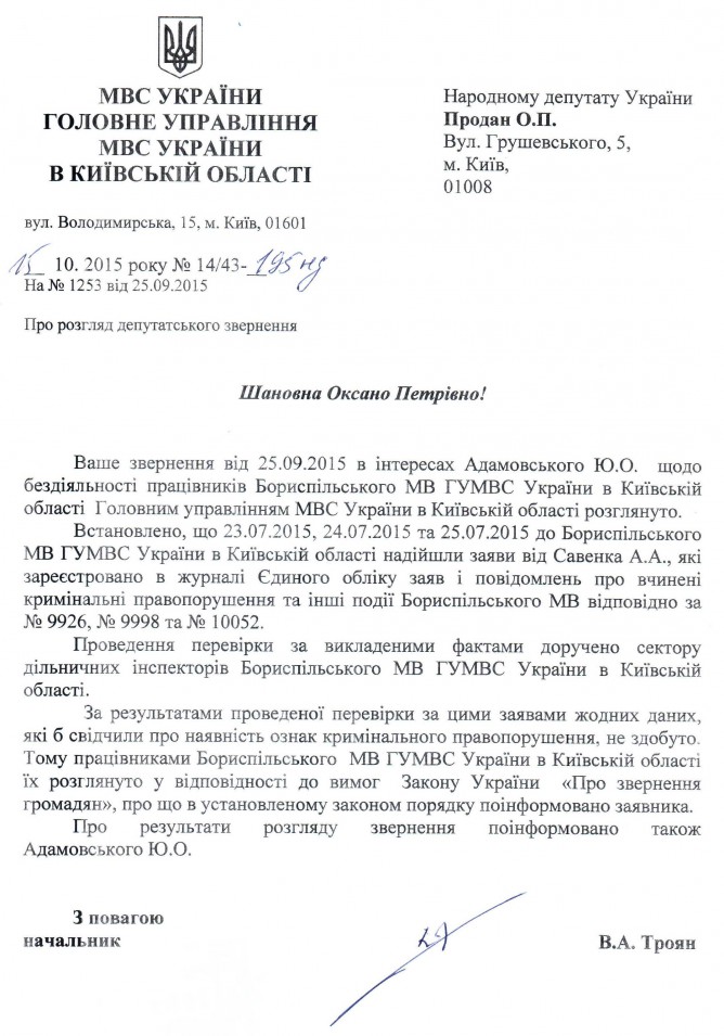 06Лис Коментування вимкнено Відповідь ГУ МВС України в Київській області на депутатське звернення щодо неналежного виконання посадових обов’язків співробітниками Бориспільського МВ ГУМВС України в Київській області ДЕПУТАТСЬКЕ ЗВЕРНЕННЯ