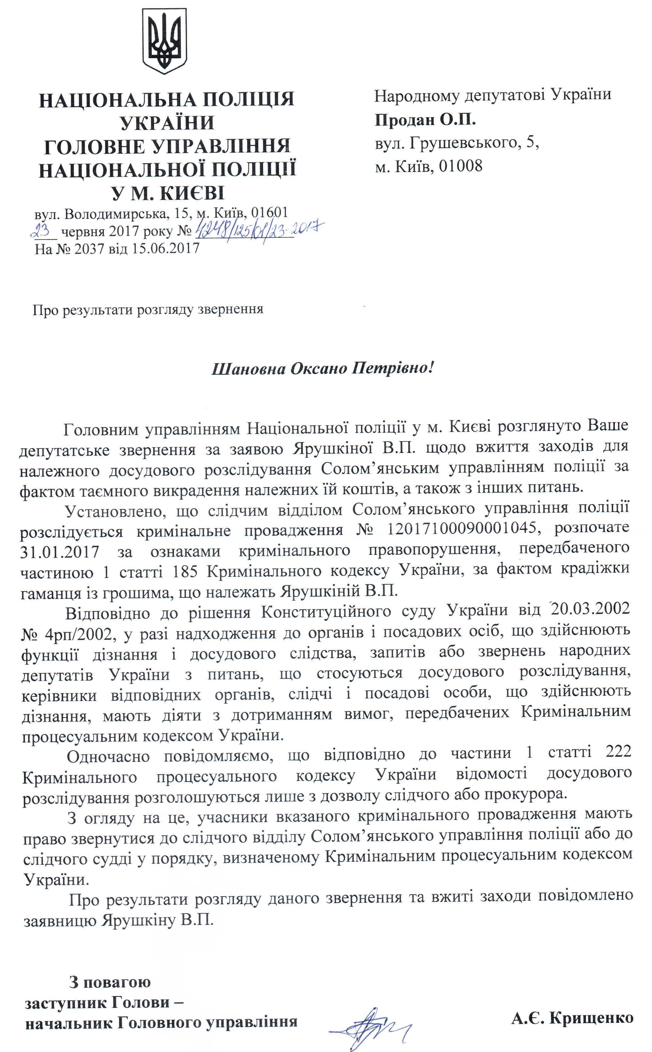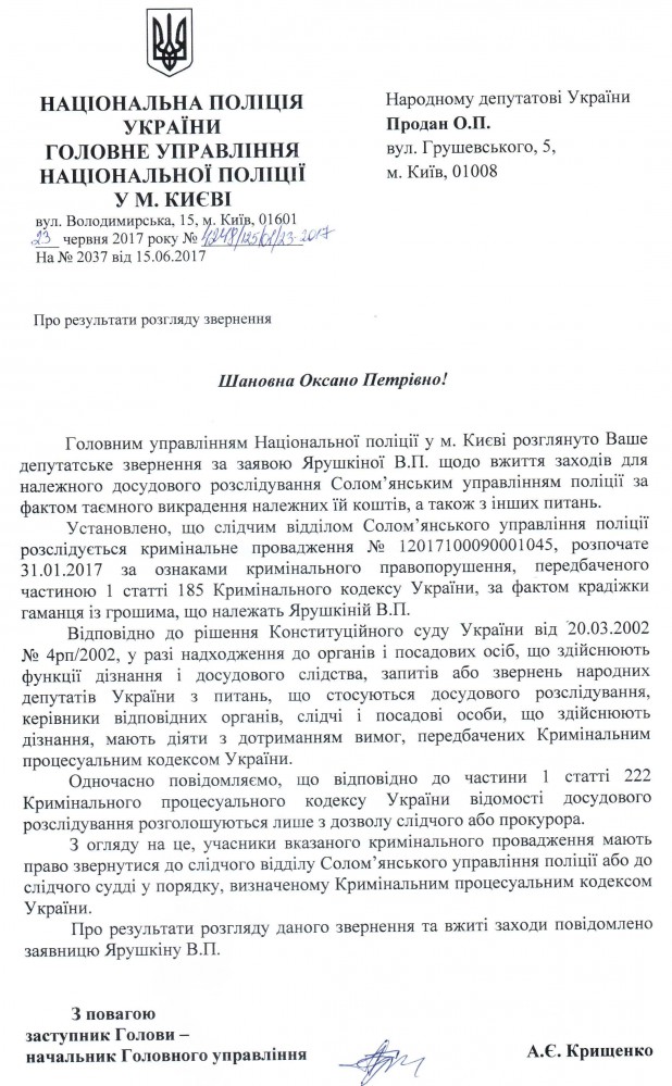 08Сер Коментування вимкнено Відповідь ГУ Національної поліції у м. Києві на депутатське звернення щодо неналежного виконання посадових обов’язків співробітниками Солом’янського УП ГУНП у м. Києві ДЕПУТАТСЬКЕ ЗВЕРНЕННЯ