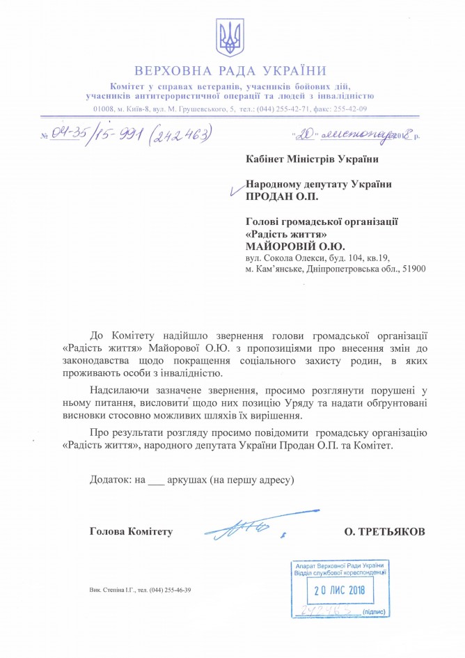 Відповідь Комітету ВРУ у справах ветеранів, учасників бойових дій, учасників АТО та людей з інвалідністю щодо підготовки змін до діючого законодавства в частині розширення пільг сім’ям, які мають дітей з інвалідністю, та особам з інвалідністю з дитинства, які визнані непрацездатними