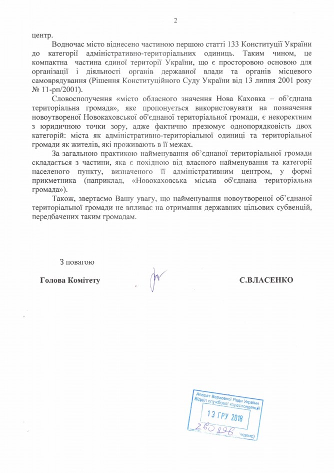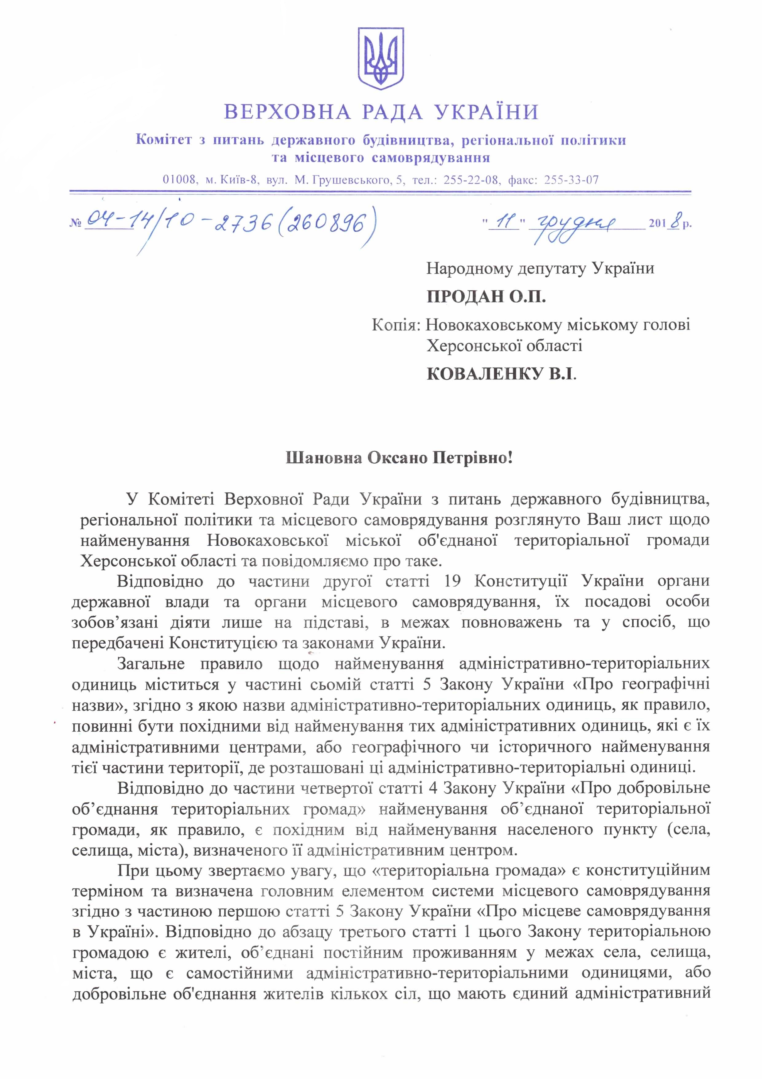 Вхідна документація > Відповідь Комітету ВРУ з питань державного будівництва, регіональної політики та місцевого самоврядування на депутатське звернення щодо єдиної правильної назви новоствореної об’єднаної територіальної громади