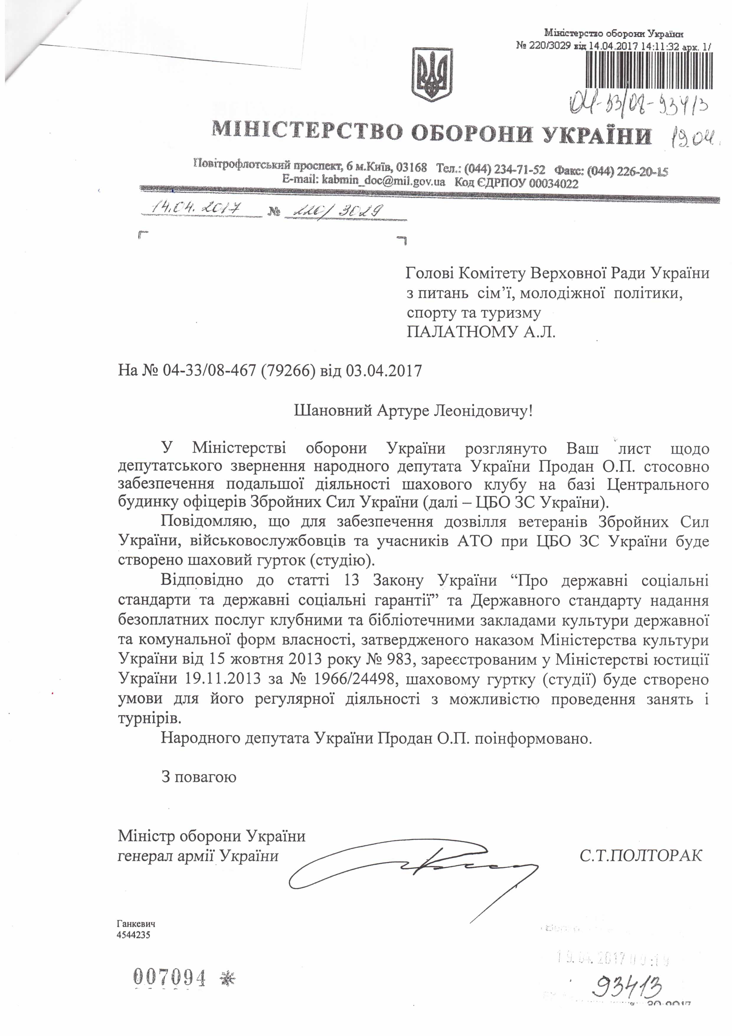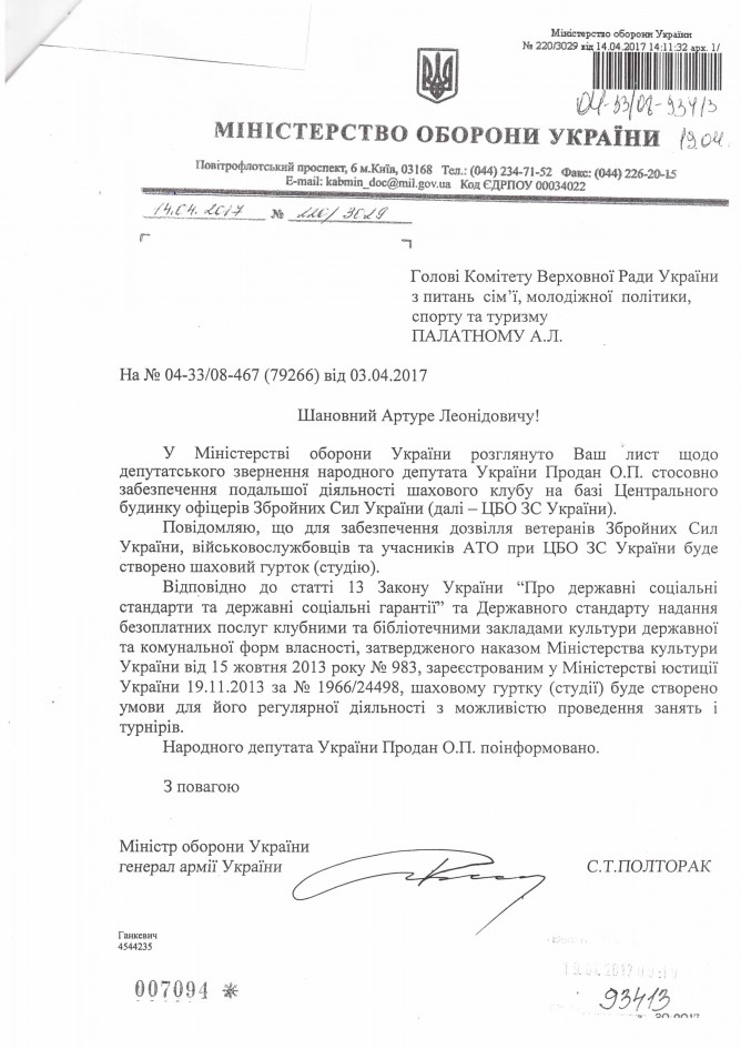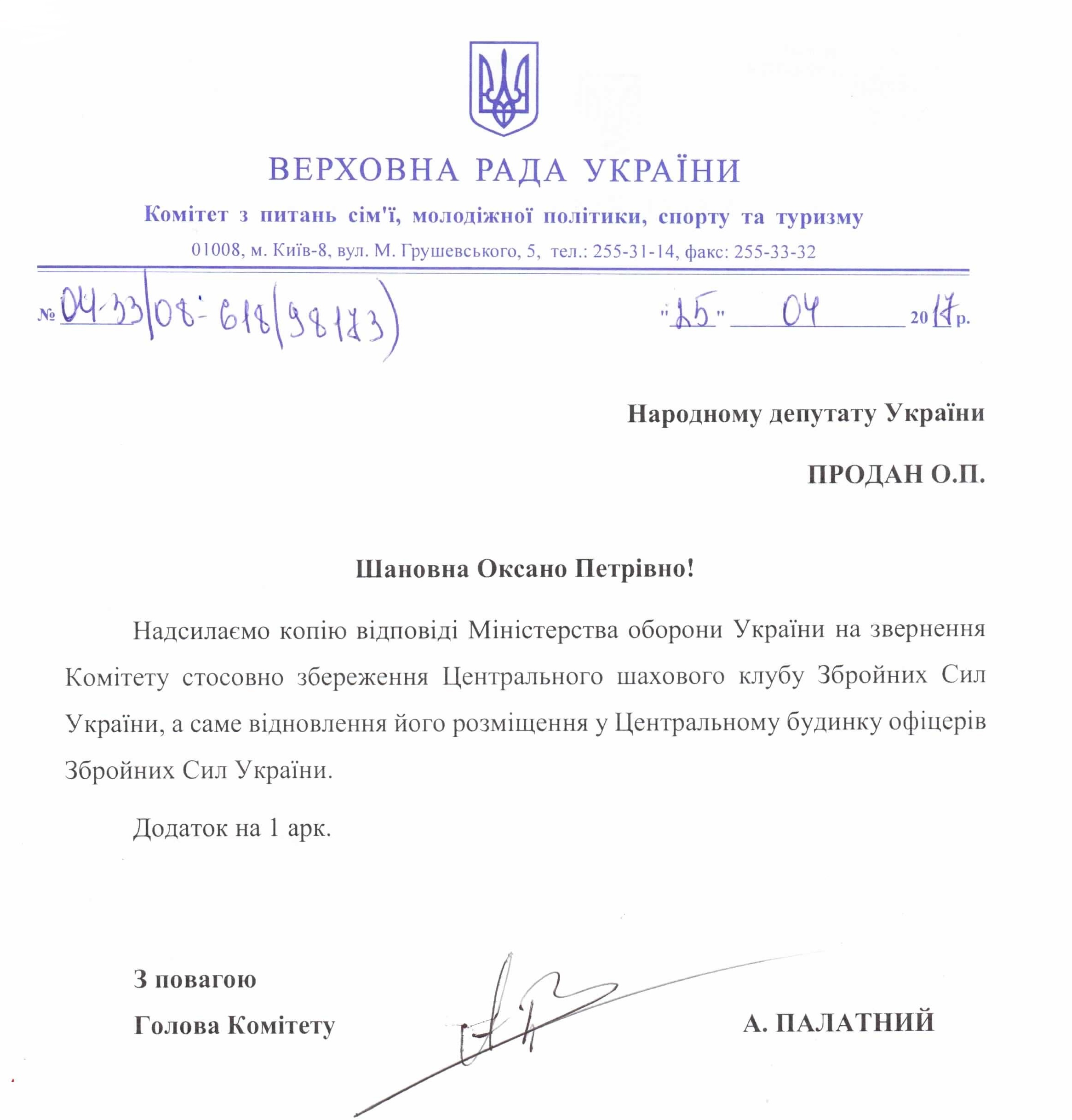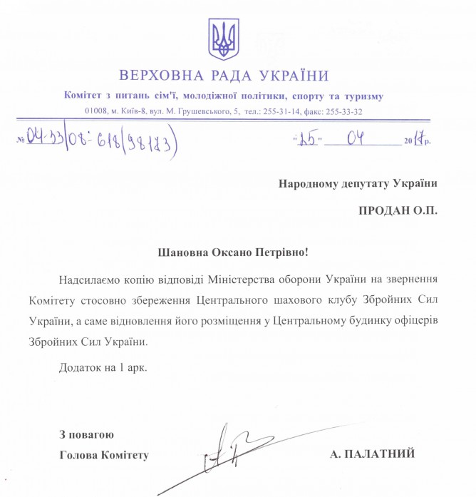 Відповідь Комітету ВРУ з питань сім’ї, молодіжної політики, спорту та туризму на депутатське звернення щодо збереження діяльності Центрального шахового клубу Збройних сил України