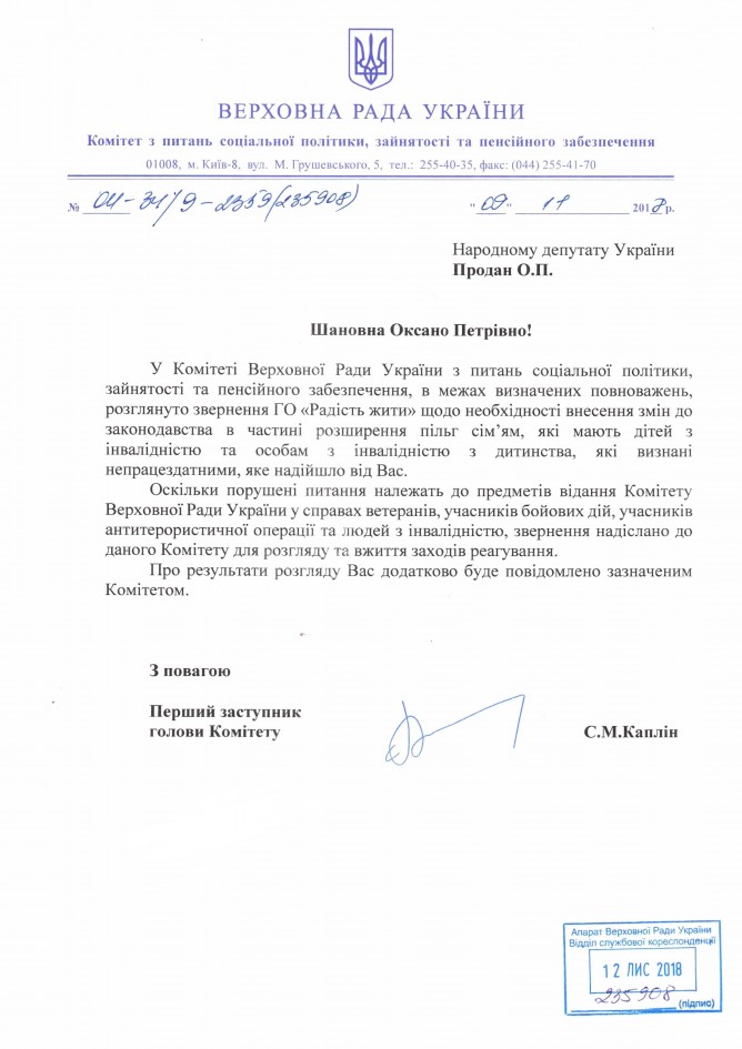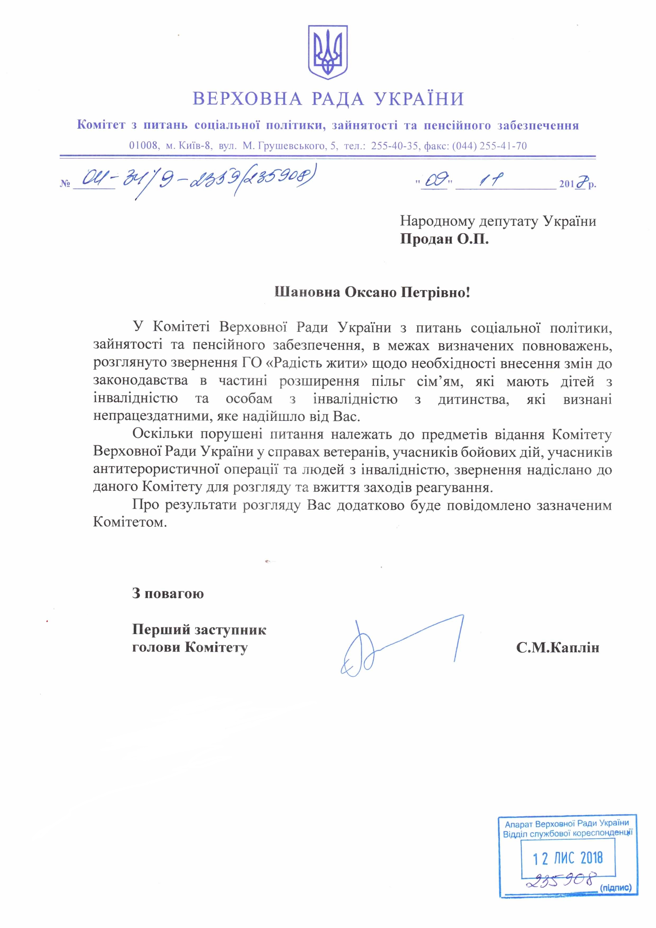 Відповідь Комітету ВРУ з питань соціальної політики, зайнятості та пенсійного забезпечення на депутатське звернення щодо підготовки змін до діючого законодавства в частині розширення пільг сім’ям, які мають дітей з інвалідністю, та особам з інвалідністю з дитинства, які визнані непрацездатними