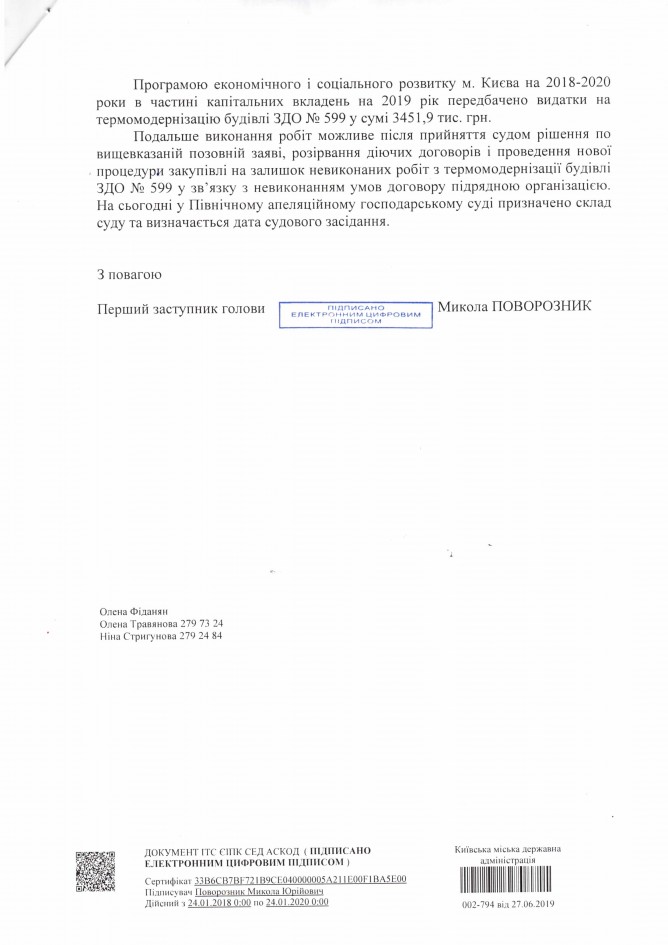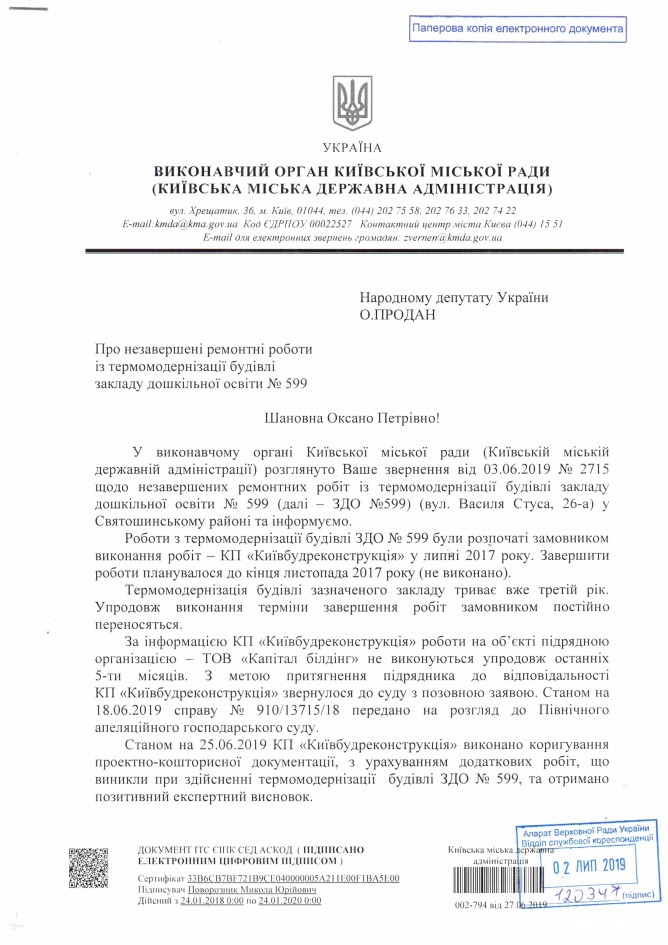 Відповідь Київської міської державної адміністрації на депутатське звернення щодо незавершених ремонтних робіт дошкільного навчального закладу №599