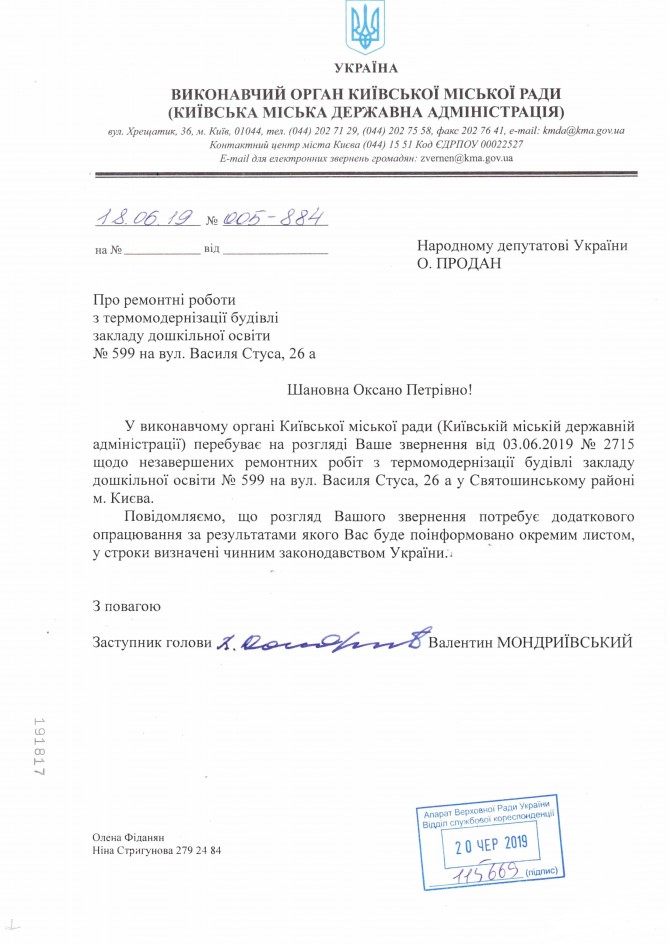 Відповідь Київської міської державної адміністрації на депутатське звернення щодо незавершених ремонтних робіт дошкільного навчального закладу №599
