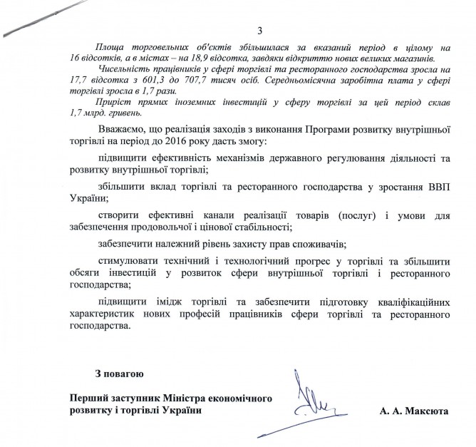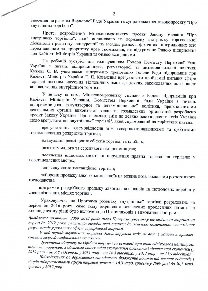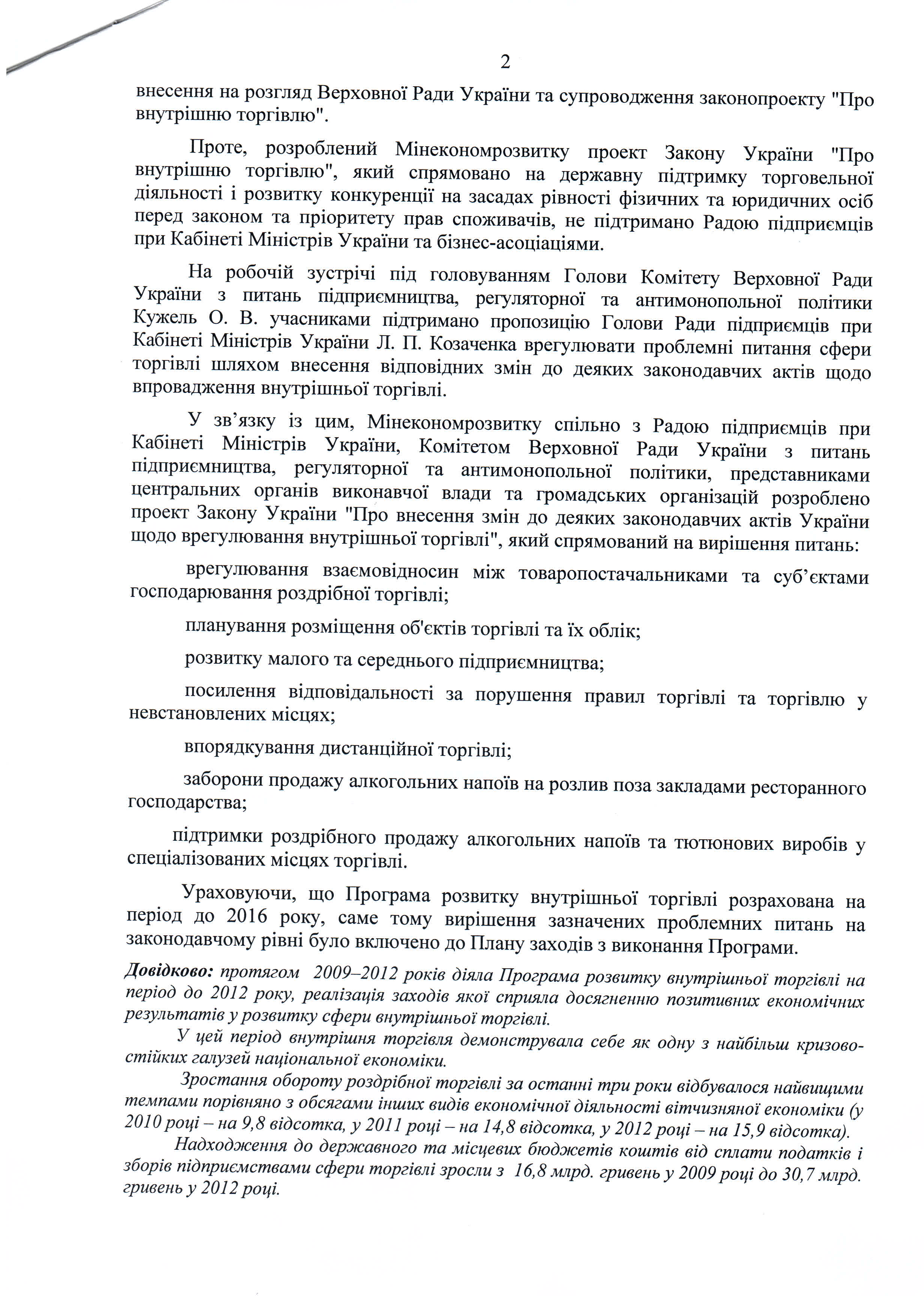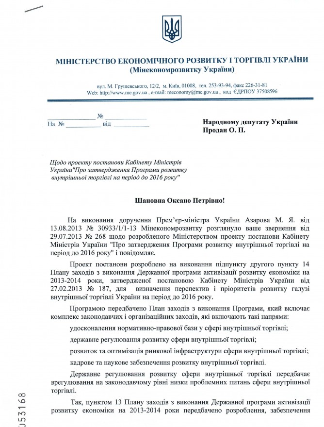 Вхідна документація > Відповідь Мінекономрозвитку на депутатське зверненя щодо недоцільності прийняття проекту Постанови Кабінету Міністрів України “Про затвердження Програми розвитку внутрішньої торгівлі України на період до 2016 року”