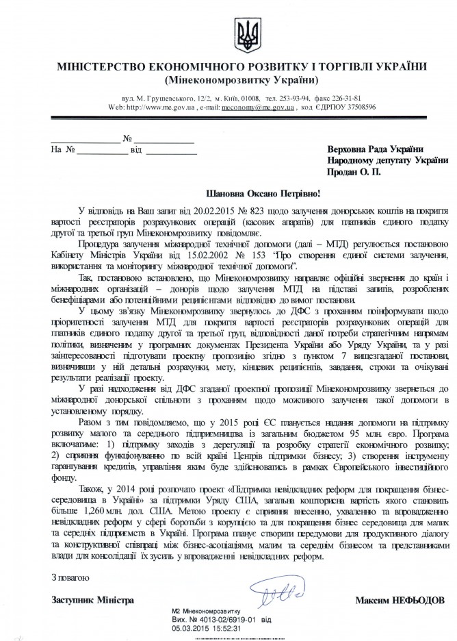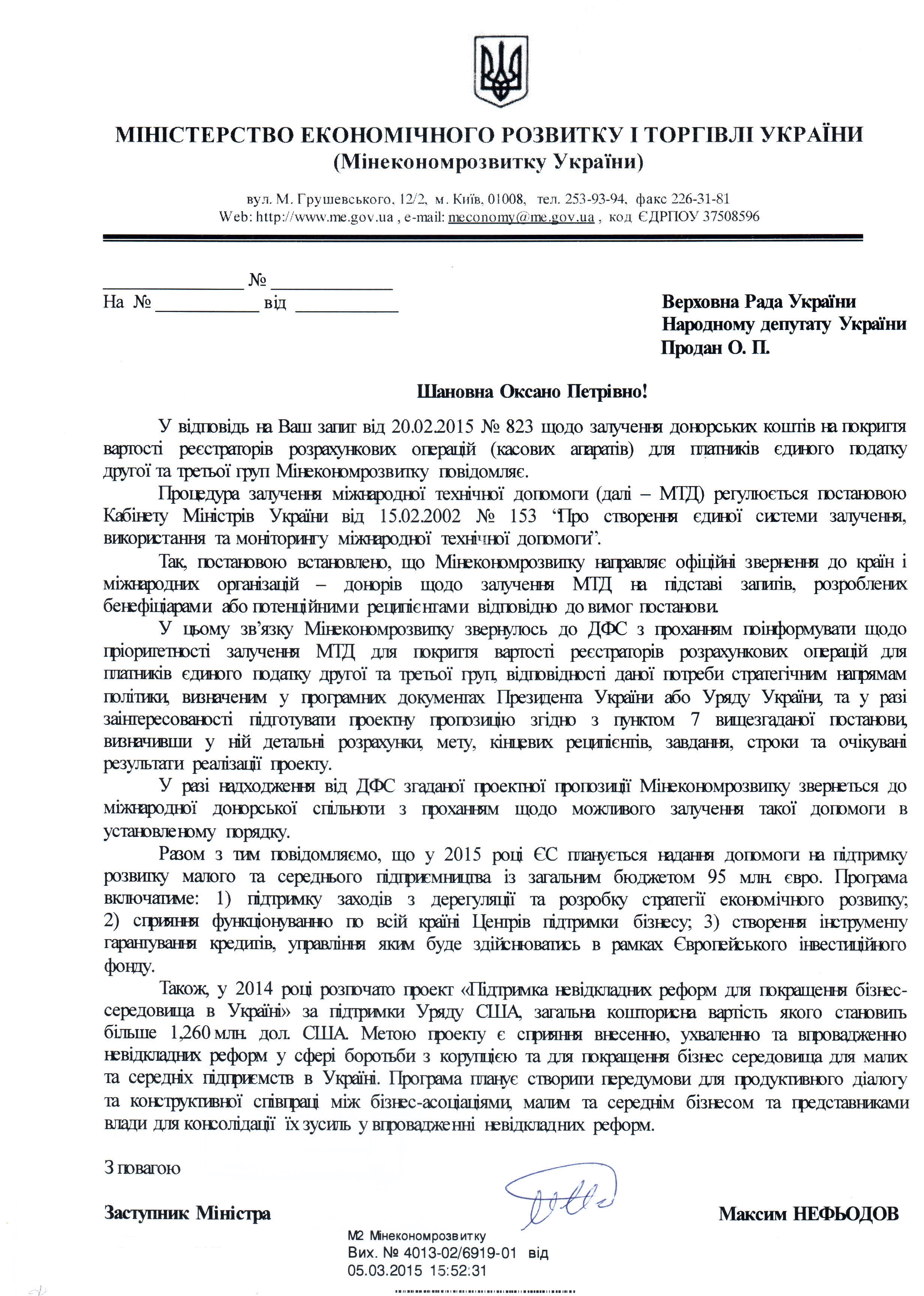 24Бер Коментування вимкнено Відповідь Мінекономрозвитку України на депутатське звернення щодо залучення донорських коштів на покриття вартості РРО (касових апаратів) ДЕПУТАТСЬКЕ ЗВЕРНЕННЯ