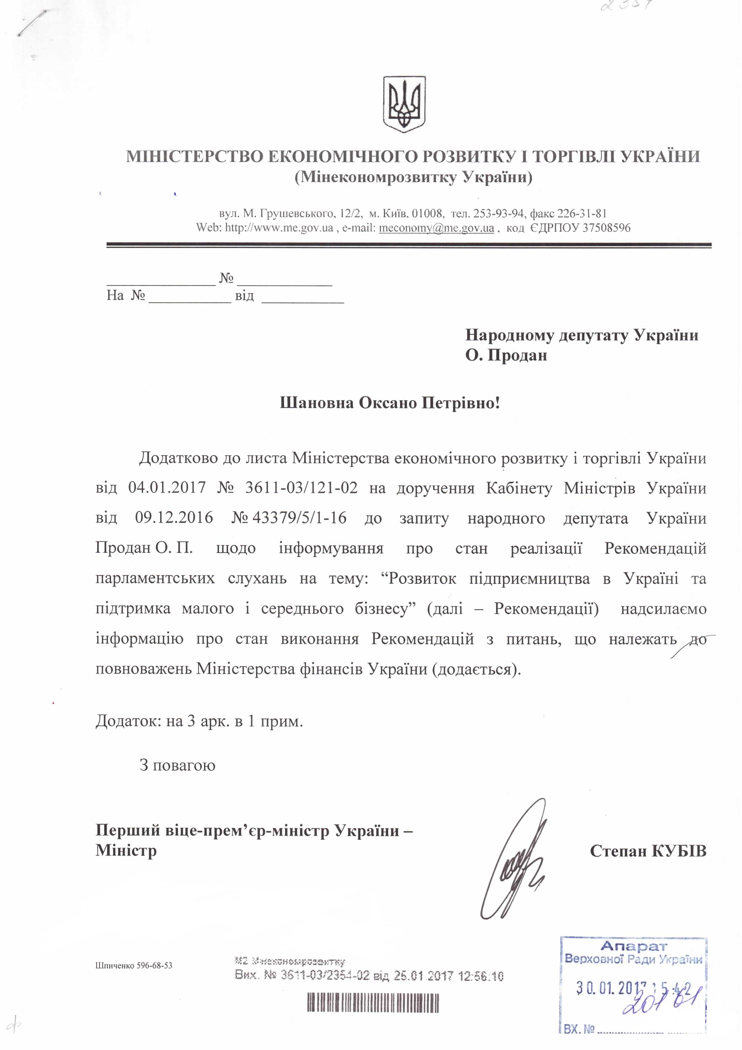 Вхідна документація > Відповідь Мінекономрозвитку України на депутатський запит щодо звіту Кабінету Міністрів України про стан реалізації Рекомендацій парламентських слухань на тему: “Розвиток підприємництва в Україні та підтримка малого і середнього бізнесу”