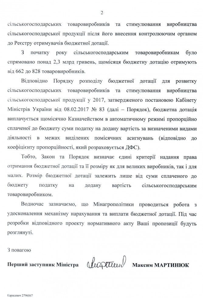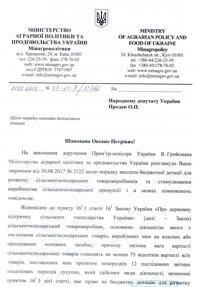 13Жов Коментування вимкнено Відповідь Міністерства аграрної політики та продовольства України на депутатське звернення щодо порядку виділення бюджетних дотацій для розвитку сільськогосподарських товаровиробників ДЕПУТАТСЬКЕ ЗВЕРНЕННЯ
