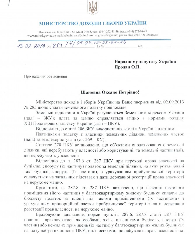 28Вер Коментування вимкнено Відповідь Міністерства доходів і зборів України на депутатське звернення щодо сплати земельного податку