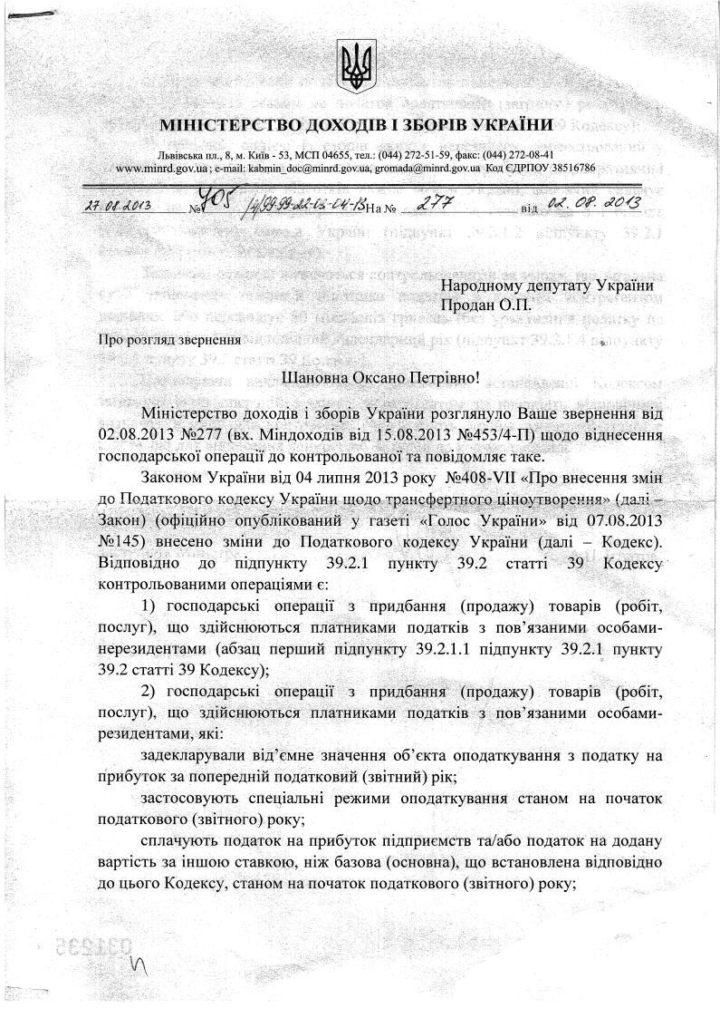 09Вер Коментування вимкнено Відповідь Міністерства доходів і зборів України на депутатське звернення щодо віднесення господарської операції до контрольованої