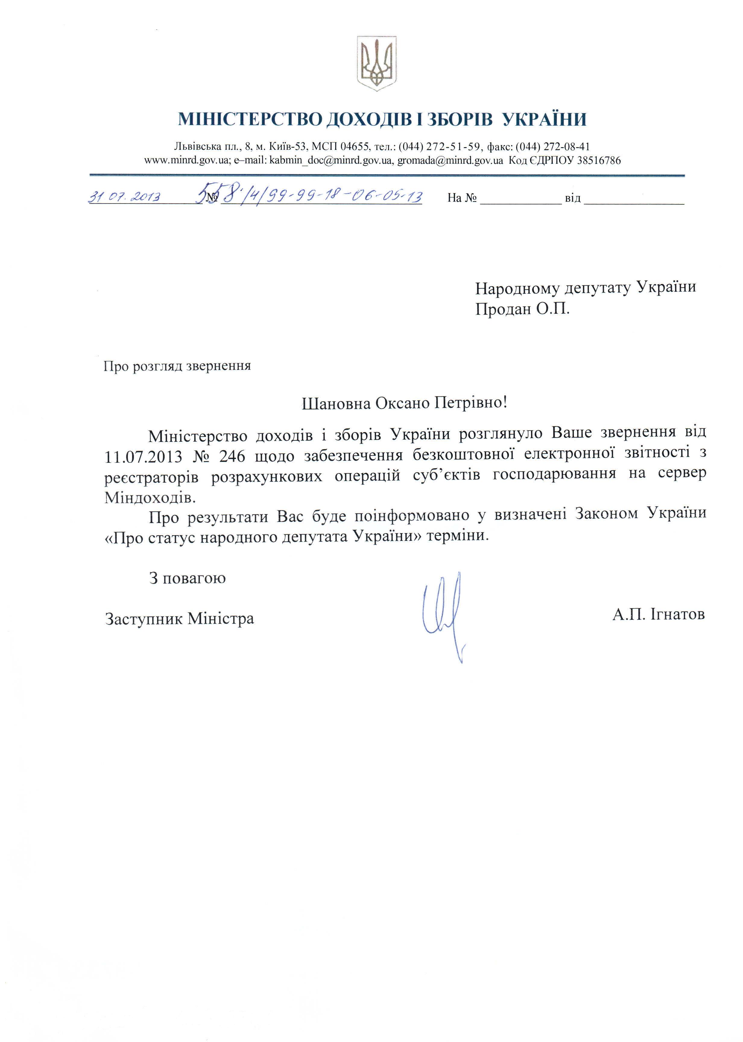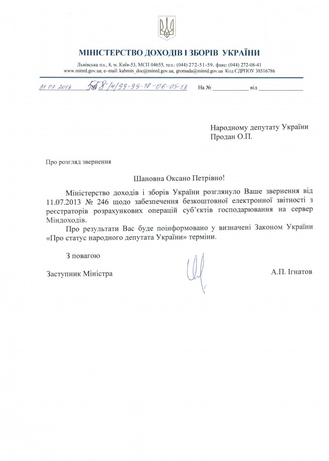 Головна > Верховна Рада України > Вхідна документація > Відповідь Міністерства доходів і зборів України щодо забезпечення безкоштовної передачі електронної звітності з РРО на сервер ДПС України