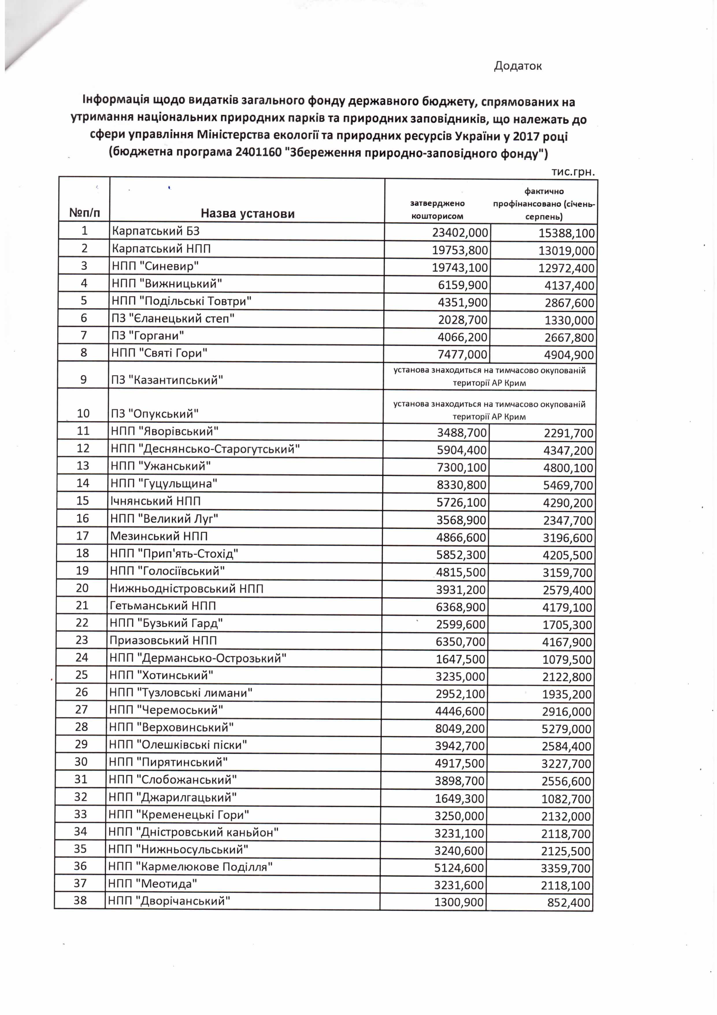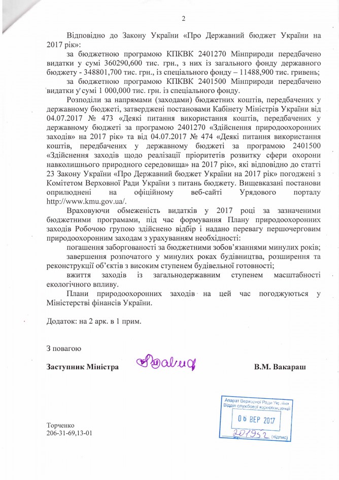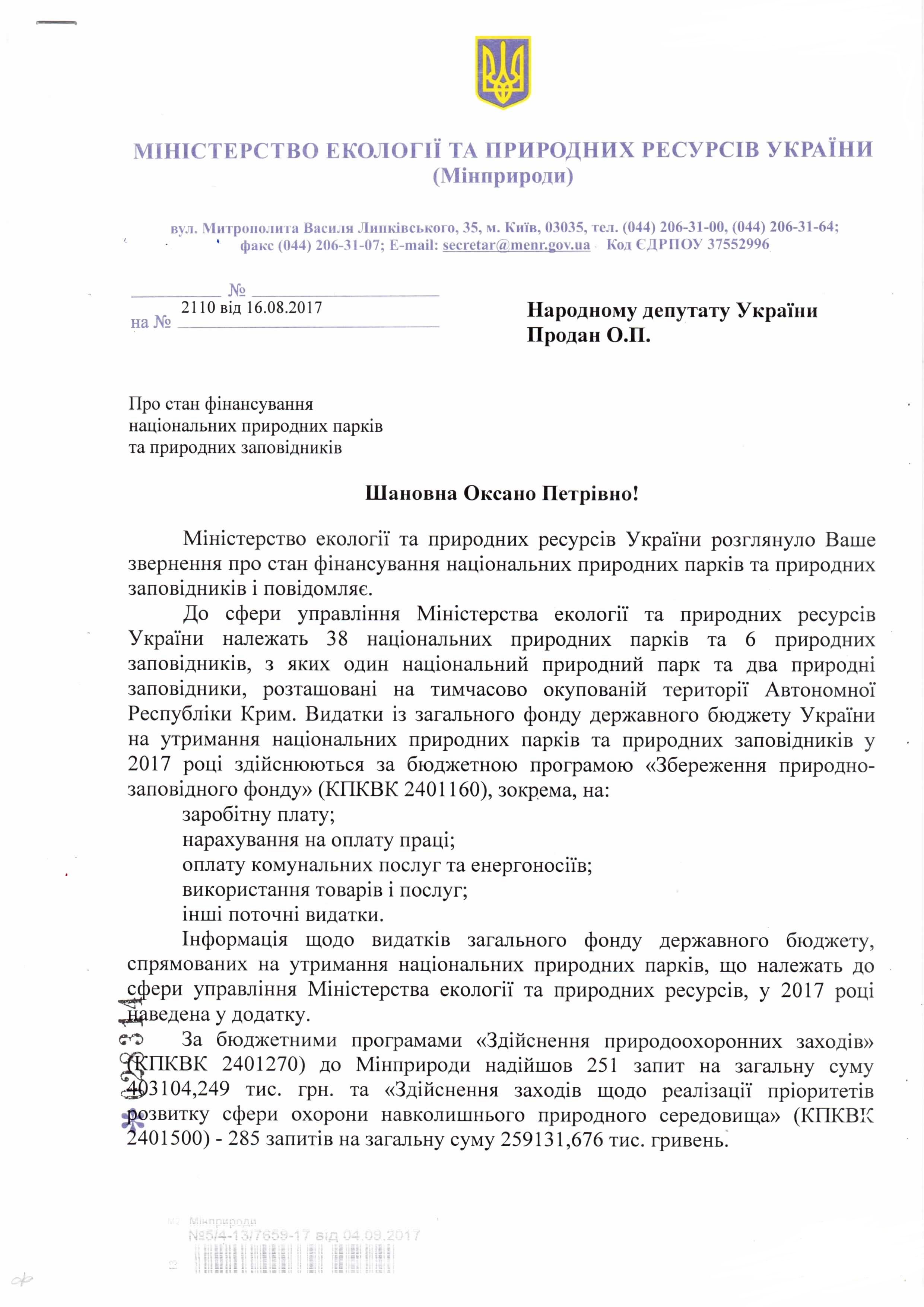 18Вер Коментування вимкнено Відповідь Міністерства екології та природних ресурсів України на депутатське звернення щодо стану фінансування національних природних парків та природних заповідників ДЕПУТАТСЬКЕ ЗВЕРНЕННЯ