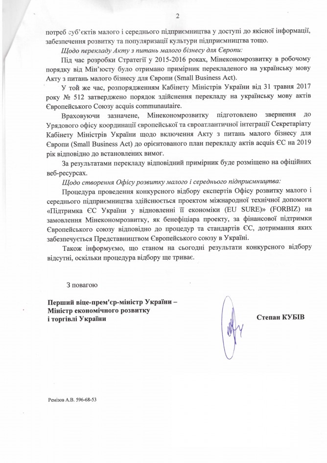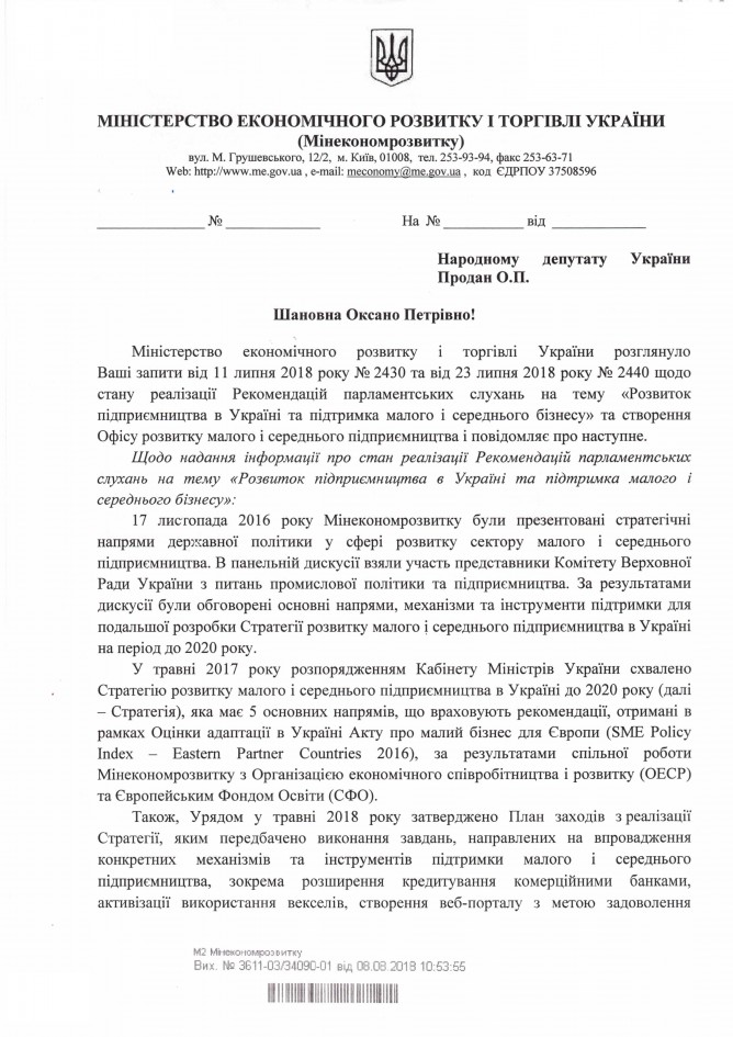 Вхідна документація > Відповідь Міністерства економічного розвитку і торгівлі України на депутатські звернення щодо стану реалізації Рекомендацій парламентських слухань щодо розвитку та підтримки МСБ та щодо створення Офісу розвитку малого і середнього підприємництва