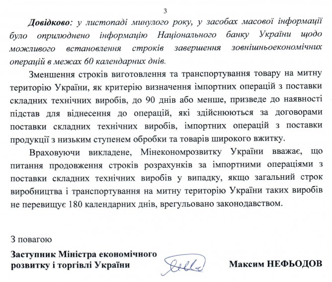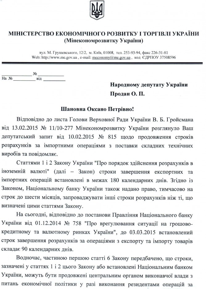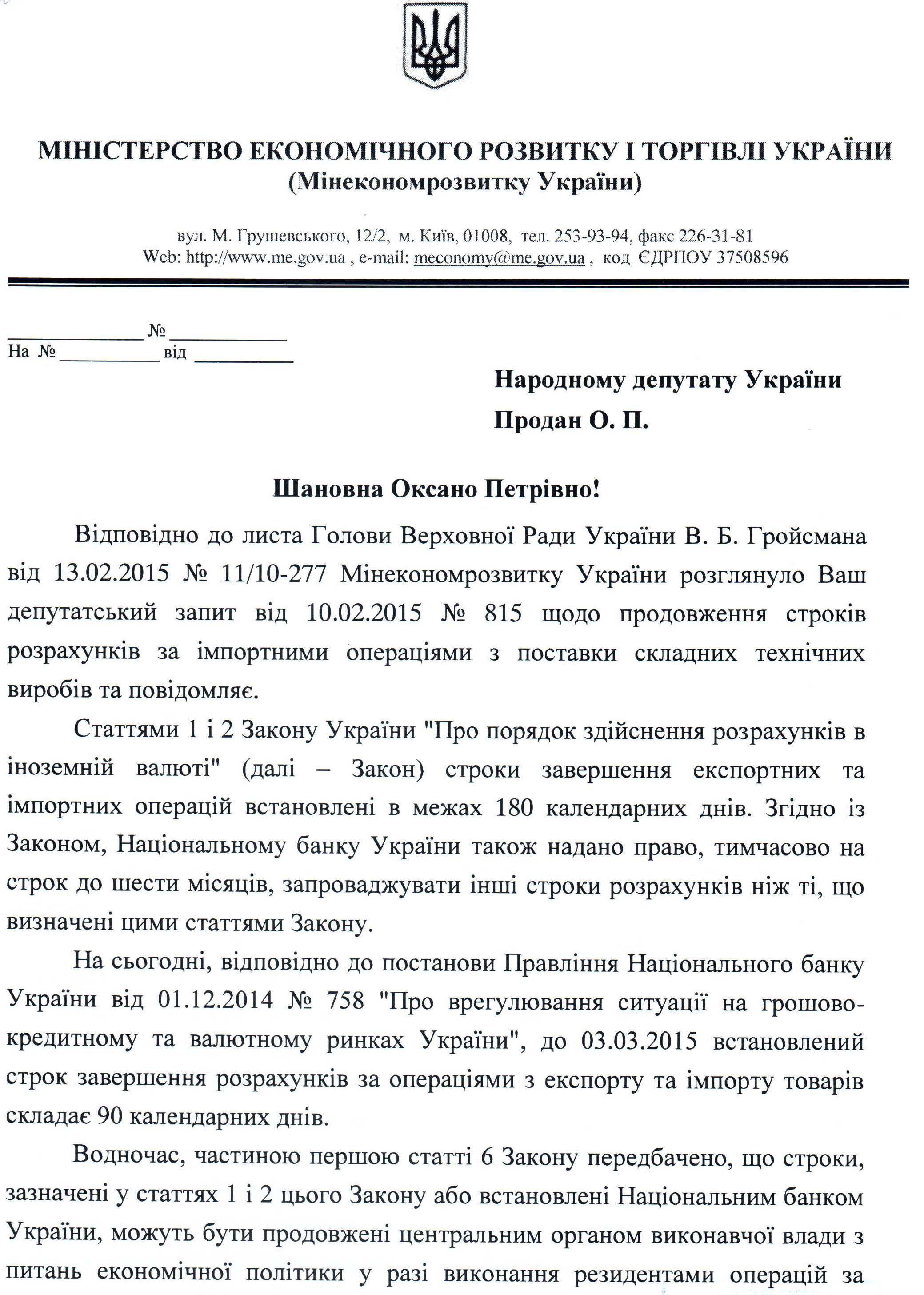 27Бер Коментування вимкнено Відповідь Міністерства економічного розвитку і торгівлі України на депутатський запит щодо продовження строків розрахунків за імпортними операціями з поставки складних технічних виробів ДЕПУТАТСЬКЕ ЗВЕРНЕННЯ