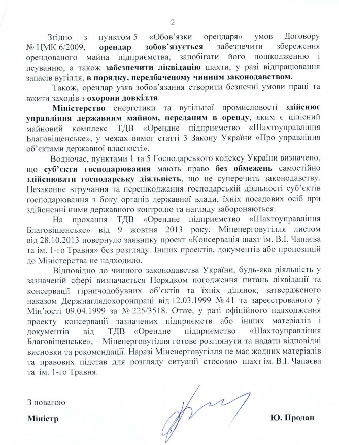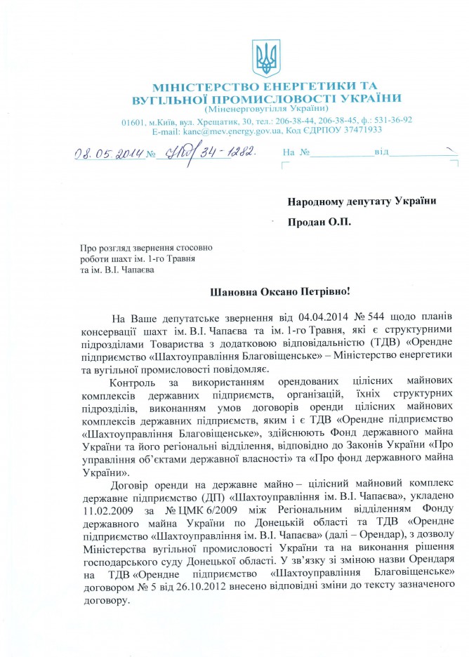 Головна > Верховна Рада України > Вхідна документація > Відповідь Міністерства енергетики та вугільної промисловості України на депутатське звернення щодо збереження діяльності шахт ім. 1-го Травня та ім. В.І. Чапаєва у м. Шахтарськ Донецької області