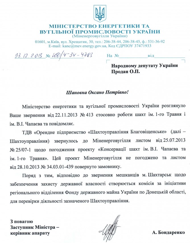 19Гру Коментування вимкнено Відповідь Міністерства енергетики та вугільної промисловості України щодо діяльності шахт ім. 1-гоТравня та ім. В.І. Чапаєва у Донецькій області ДЕПУТАТСЬКЕ ЗВЕРНЕННЯ
