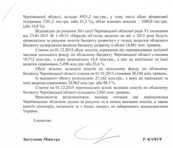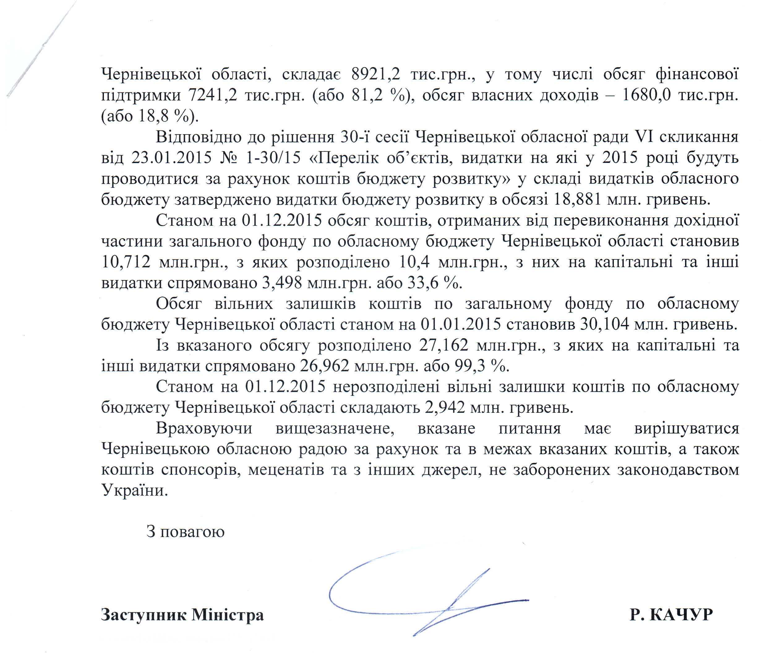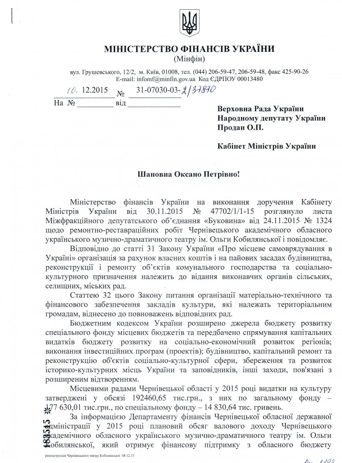 Вхідна документація > Відповідь Міністерства фінансів України на депутатське звернення членів МФО “Буковина” щодо забезпечення фінансування ремонтно-реставраційних робіт Чернівецького драматичного театру ім. Ольги Кобилянської