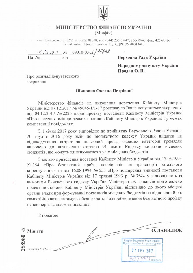 Відповідь Міністерства фінансів України на депутатське звернення щодо проекту постанови Кабінету Міністрів України «Про внесення змін до деяких постанов Кабінету Міністрів України»