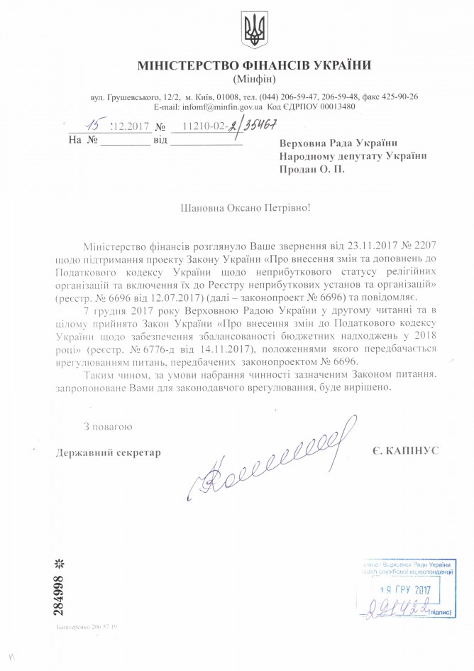 Вхідна документація > Відповідь Міністерства фінансів України на депутатське звернення щодо проекту Закону України «Про внесення змін до Податкового кодексу України щодо неприбуткового статусу релігійних організацій та включення їх до Реєстру неприбуткових установ та організацій», реєстр. №6696