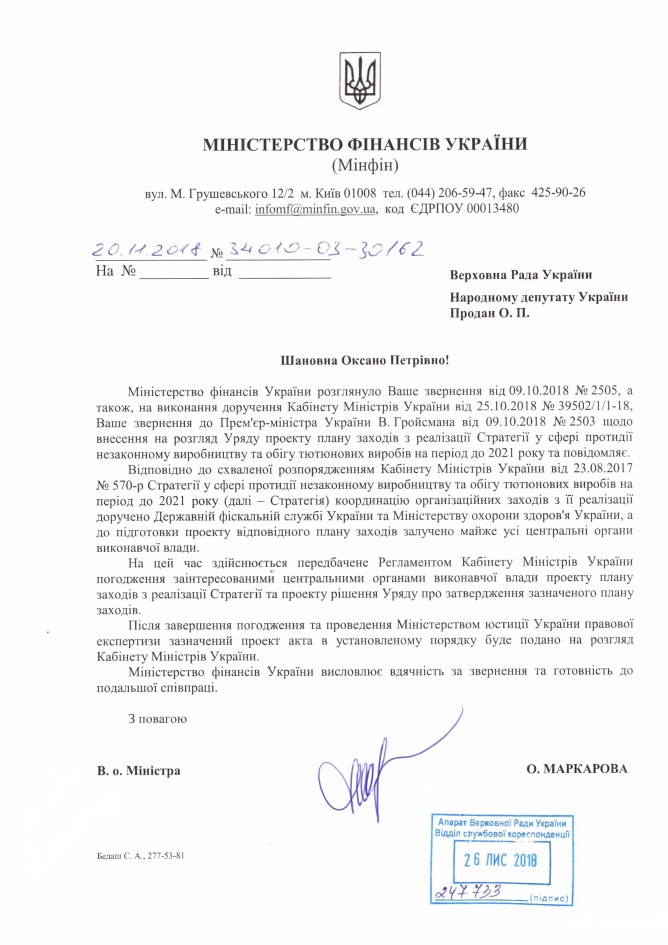 Відповідь Міністерства фінансів України на депутатське звернення щодо реалізації Стратегії боротьби з незаконним виробництвом і обігом тютюнових виробів до 2021 року