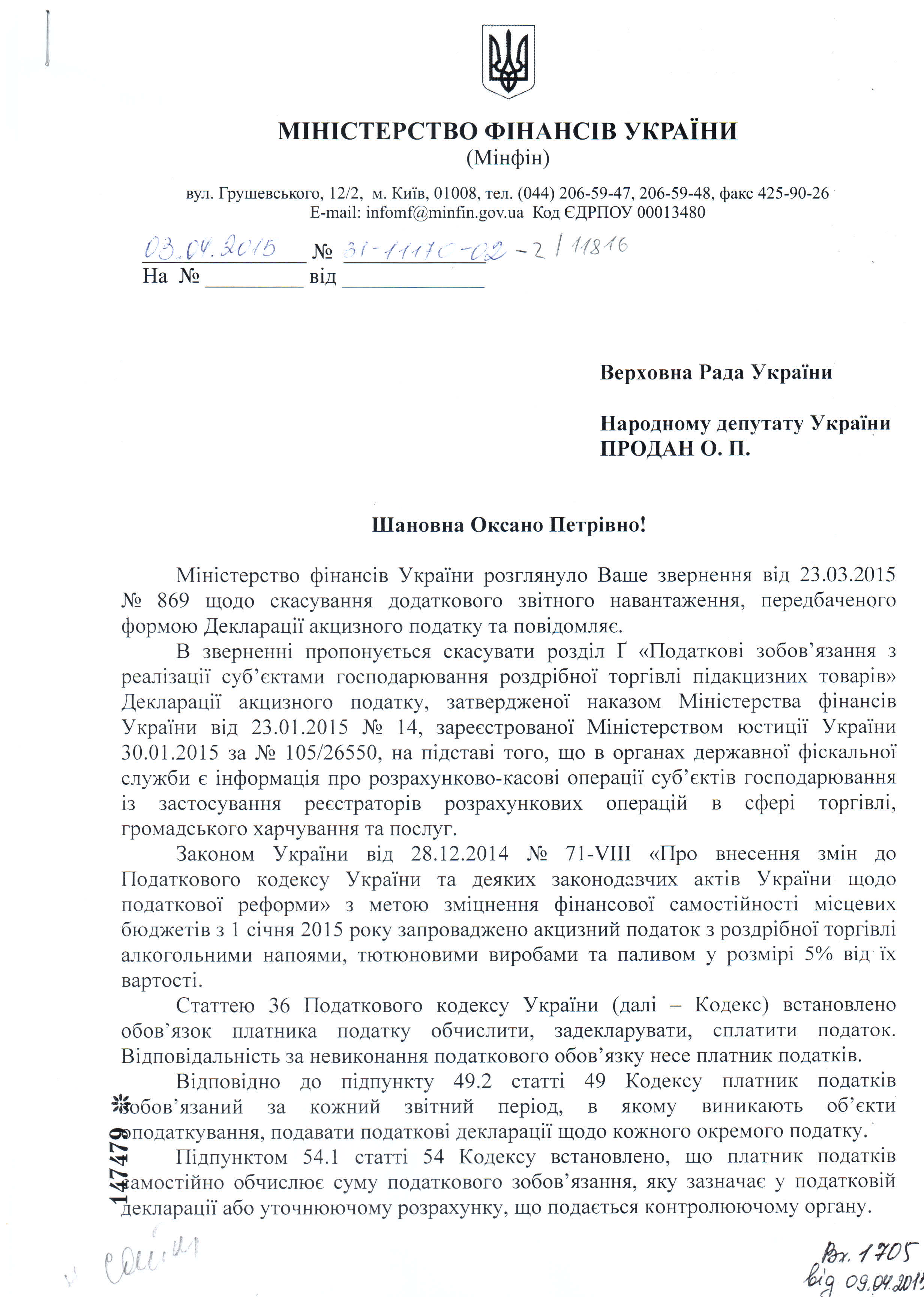 21Кві Коментування вимкнено Відповідь Міністерства фінансів України на депутатське звернення щодо скасування додаткового звітного навантаження, передбаченого формою Декларації акцизного податку ДЕПУТАТСЬКЕ ЗВЕРНЕННЯ